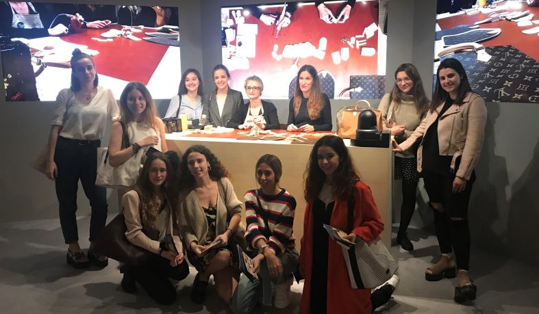 Al inicio de la exposición, nuestros alumnos se vieron sorprendidos con la oportunidad de poder ver y conversar con una de las artesanas de la Maison, con más de 20 años de experiencia, que realizaba el minucioso trabajo de pintar a mano piezas de piel y con calor marcarlas como una de las señas de identidad de la Casa. Durante la visita guiada, han recorrido los cuatro temas principales de la exposición: los códigos de la Maison, los viajes, la elegancia en movimiento y los iconos.