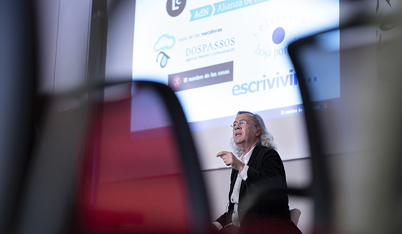 A los quince años tuvo clara su vocación de escritor. Más tarde desistió de los estudios de Derecho al vender sus libros de primer curso en la Cuesta de Moyano. “Quemé las naves y llegué gritando a la poesía. Escribí un poema y me sentí útil porque salí corriendo a leérselo a alguien”, rememoró. Luego llegó “la bronca” con sus padres, la huida de casa, las paces, los cuadernos donde anotaba todo –y donde lo anota todo (tenía uno en su conferencia en uno de los bolsillos de su chaqueta)-, y las lecturas, entre las que confesó su debilidad por Dios ha nacido en el exilio, la novela de Vintilă Horia, en cuyo volumen rodeaba las palabras o frases que le llamaban la atención. “Cuando ya tienes claro lo que vas a hacer, aprendes la voracidad de aprender, de saber de todo”, dijo.