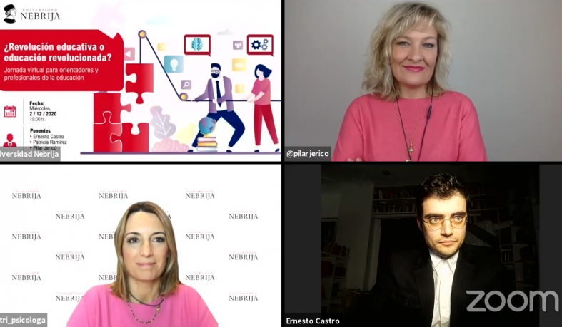 ¿Revolución educativa o educación revolucionada? Esta pregunta, que dio título a la Jornada Virtual para Orientadores y Profesionales de la Educación organizada por la Universidad Nebrija, no fue la única planteada en el coloquio virtual con orientadores, profesores, maestros, padres, psicólogos y trabajadores sociales. Sin embargo, después de cada interrogante, el filósofo Ernesto Castro, la psicóloga Patricia Ramírez y la comunicadora Pilar Jericó brindaron su experiencia y conocimientos sobre la tolerancia a la frustración, el miedo al fracaso, la disciplina o la motivación en el entorno educativo y familiar. La sesión, moderada por María Gil, directora de Comunicación de la Universidad Nebrija, recogió un enfoque multidisciplinar y alejado de dogmas y prejuicios. Las palabras volcadas en el debate sirvieron para la reflexión en mentes de todas las edades.