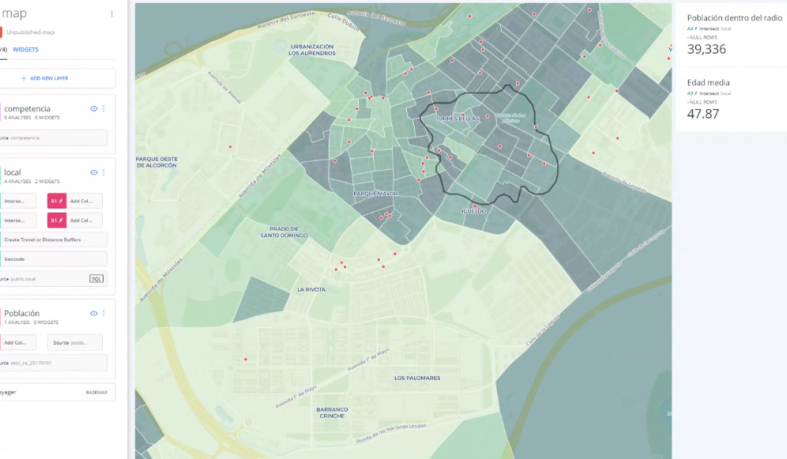 CARTO es una plataforma online española que permite a los usuarios cargar datos y proporciona herramientas para visualizarlos en mapas interactivos. Se usa bastante en periodismo de datos y storytelling. Álvaro Sánchez Pérez dio en directo un taller práctico ce CARTO en el que, basándose en la peluquería de su madre –en Alcorcón-, analizaba variables que se hacían visibles en un mapa al que agregaba capas y colores. Así una vez geolocalizado el establecimiento, el ingeniero de Telecomunicaciones fue añadiendo una serie de temas para potenciar el negocio como datos sobre la edad de la población o el espacio alrededor del local que se recorre en diez minutos a pie. Las decisiones de su madre, gracias a esta herramienta de visualización de datos y al business intelligence actual, estarán fundamentadas para mejorar sus cuentas al final de su año presupuestario.
