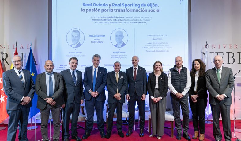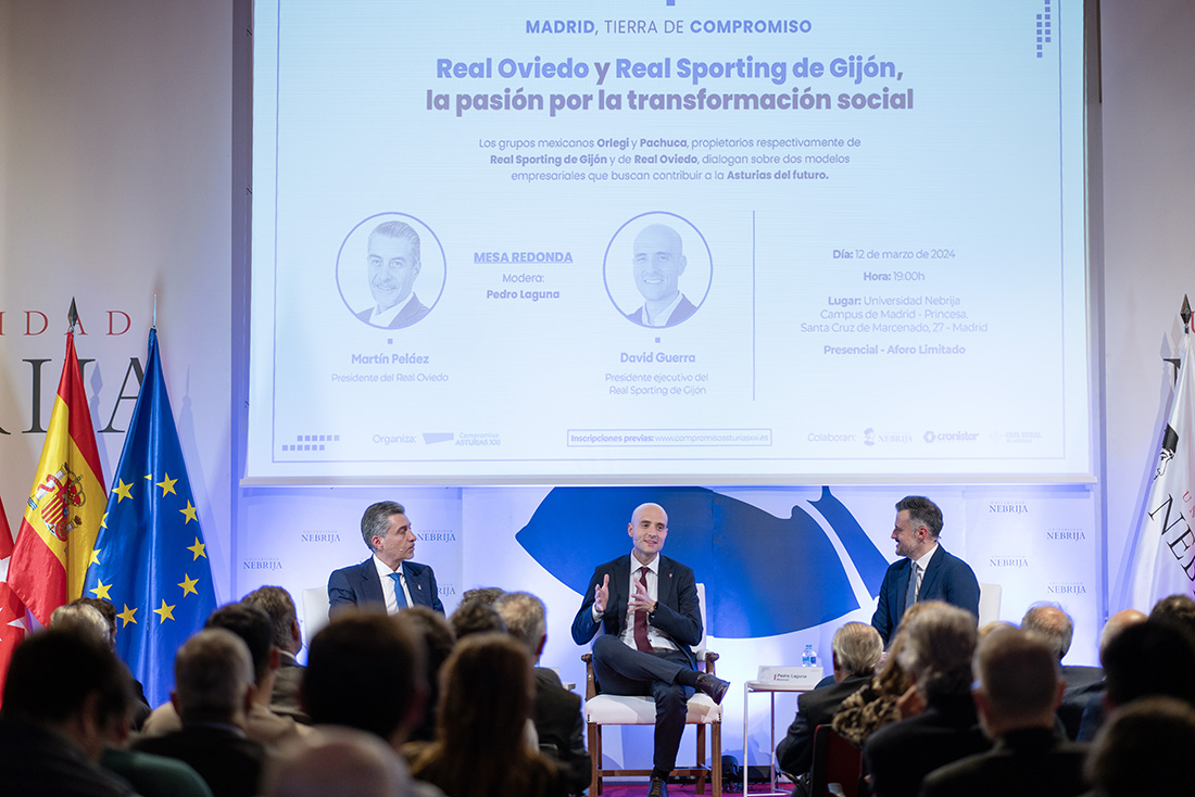 En el terreno de juego improvisado del Salón de Actos del Campus de Madrid-Princesa de la Universidad Nebrija, los presidentes del Real Oviedo y del Real Sporting Gijón, Martín Peláez y David Guerra, jugaron un partido en forma de coloquio. Fue un encuentro organizado por Compromiso Asturias XXI y en el que ambos dirigentes analizaron los modelos de gestión de los equipos asturianos y la alianza que tienen con Pachuca y Orlegi, conglomerados mexicanos que son dueños del club blanquiazul y rojiblanco, respectivamente.