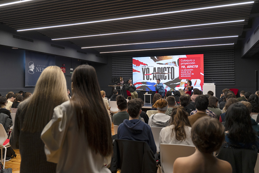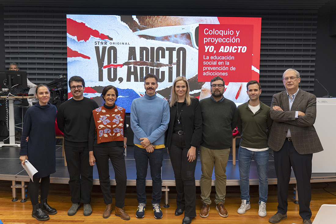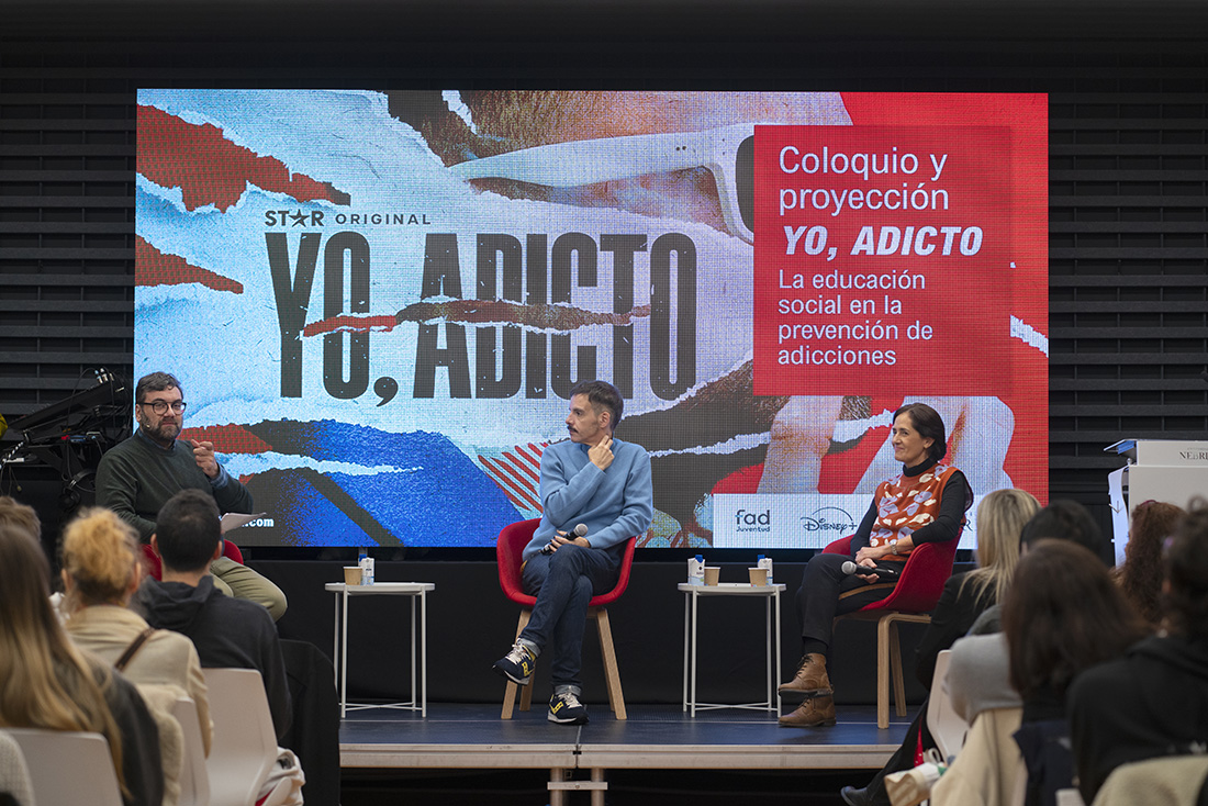 La Facultad de Comunicación y Artes de la Universidad Nebrija acoge la proyección del primer capítulo de la serie y el coloquio que apadrinan Javier Giner, Beatriz Martín Padura, directora general de Fad Juventud, y Nicolás Grijalba, director del Departamento de Comunicación. Los tres otean una sala llena de alumnos ávidos por preguntar.