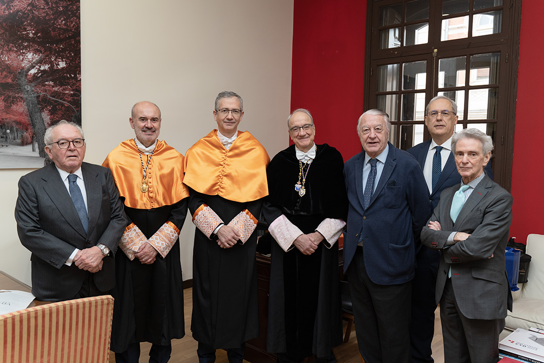 El rector reconoció que en el caso del gobernador del Banco de España le corresponde “el mérito añadido de haber tenido que bregar con el mundo de la economía, ya complejo en sí mismo, e inmerso, además, en un contexto social efervescente, con un gran ruido político de fondo”.