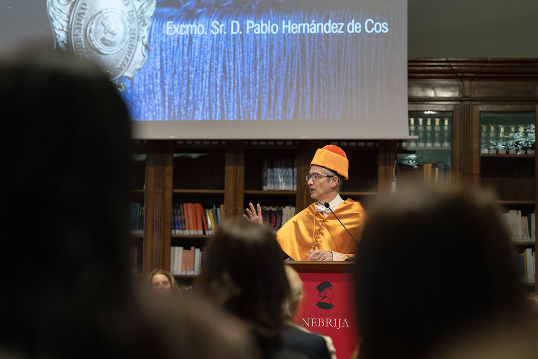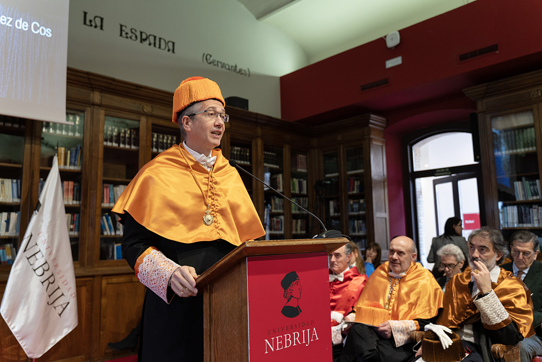 Como manda el protocolo, José Muñiz, rector de la Universidad Nebrija, tomó la palabra en último lugar. Alabó al nuevo doctor honoris causa que, al igual que otros distinguidos como el publicista Toni Segarra, el bioquímico Carlos López-Otín, la jurista Araceli Mangas o el físico Juan Ignacio Cirac, “encaja a la perfección en la filosofía de excelencia con alma que guía a la Universidad Nebrija, y que se nutre de dos grandes pasiones: la pasión por saber y la pasión por innovar y emprender”.