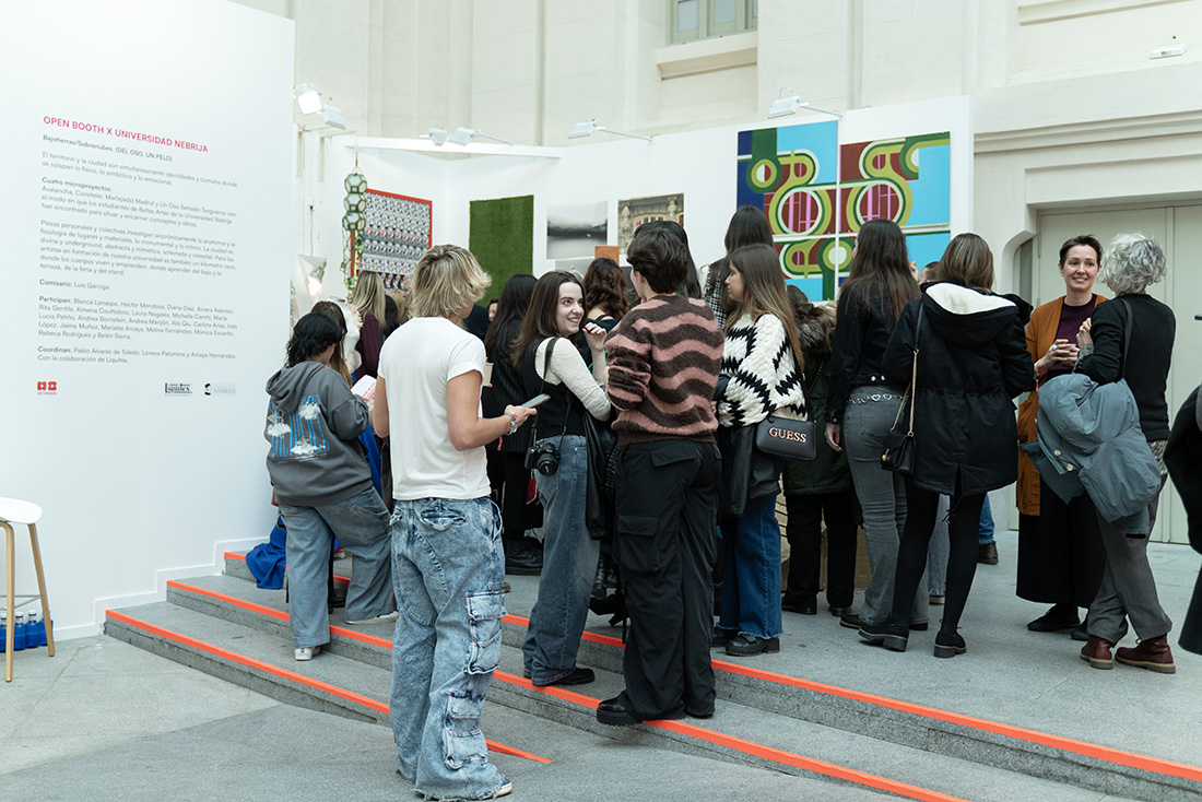 Con el apoyo de Liquitex, Open Booth no solo es un lugar estático que atrapa miradas de los visitantes, sino que representa un acicate para que los artistas en ciernes “capten ideas y mantengan encuentros” con personas consagradas y galerías audaces. Así lo expresa Pablo Álvarez de Toledo, director del Departamento de Artes de Nebrija, en el sencillo acto de inauguración. Marta Saavedra, vicedecana de la Facultad de Comunicación y Artes, corrobora este aspecto con esta apuesta por la colaboración entre la academia y la empresa y con la constatación del “orgullo” que sienten los profesores por estos audaces pupilos.