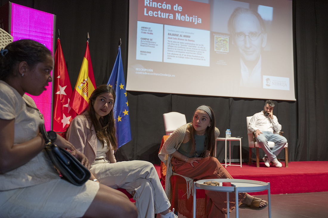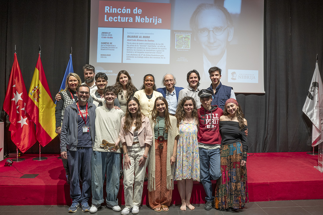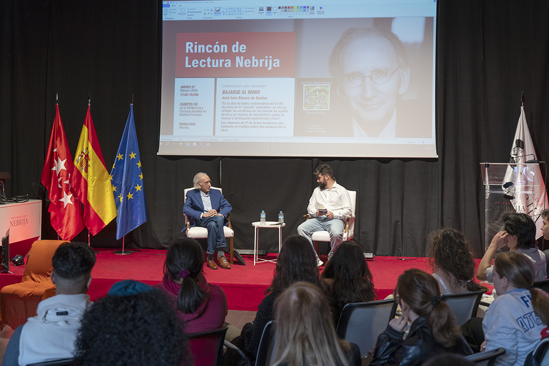 El dramaturgo José Luis Alonso de Santos llega con su mujer, Marga Piñero, profesora de la Real Escuela Superior de Arte Dramático, a un nuevo encuentro del Rincón de Lectura Nebrija, coordinado por Diego Aduriz y Rocío Santamaría. En la charla, impulsada por la Asociación Colegial de Escritores, los lectores están ávidos de saber los recovecos creativos de su clásico Bajarse al moro, pero las palabras sobre la vida, el teatro y el oficio de emborronar con palabras el papel se imponen. Lo general se lleva por delante lo particular. No importa.