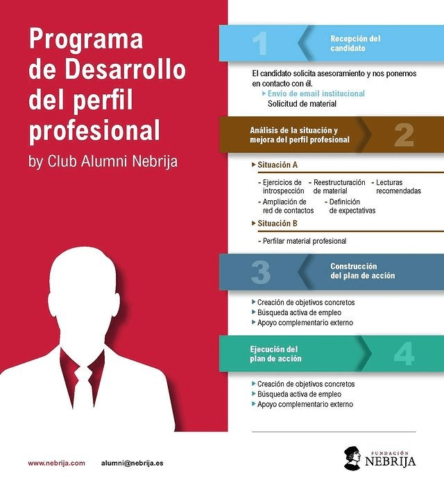 Desde el Club Alumni Nebrija trabajamos para ayudarte a mejorar como profesional. Contamos con un programa de desarrollo del perfil profesional exclusivo que consta de un programa de 4 fases y 8 horas de asesoramiento profesional personalizado.Esperamos que esta información os sirva de guía para entender mejor qué supone participar en un proceso de asesoramiento profesional. En cualquiera de los momentos profesionales en los que te encuentres.