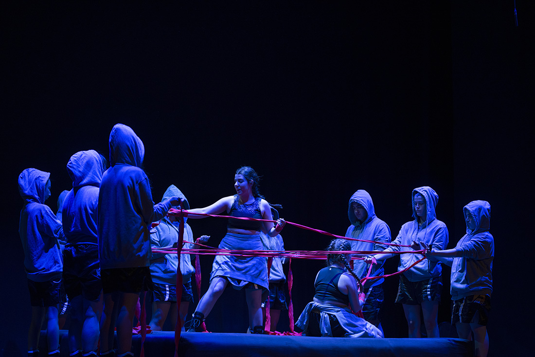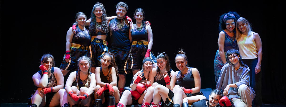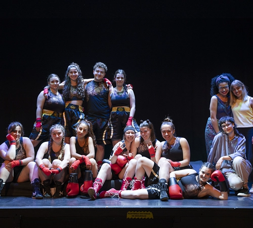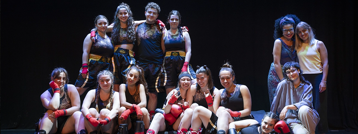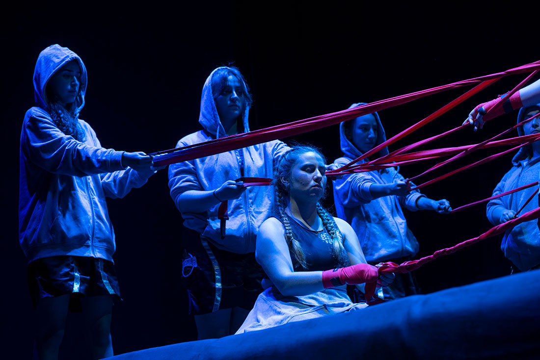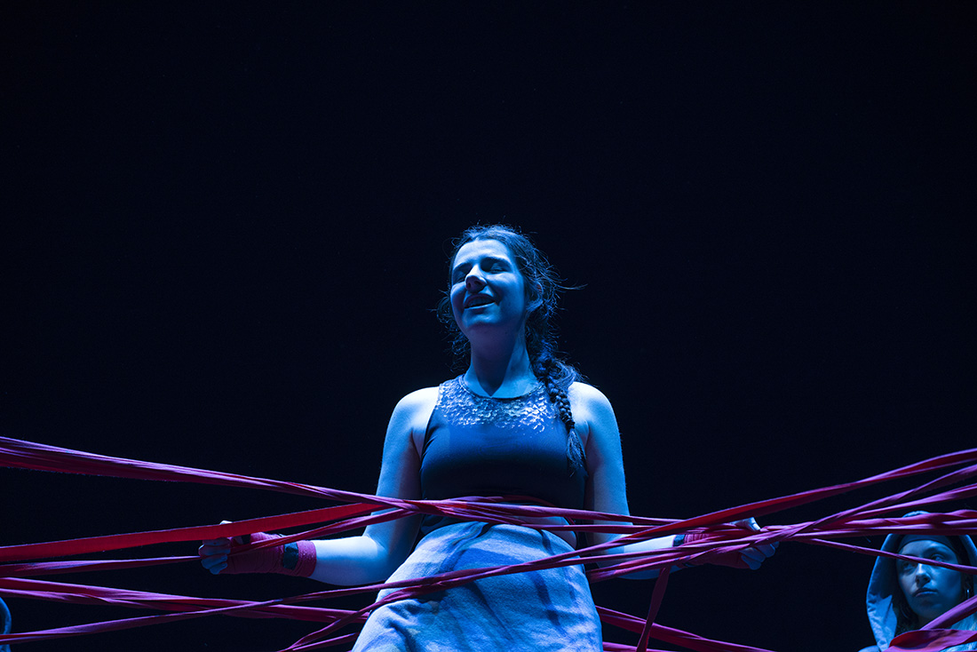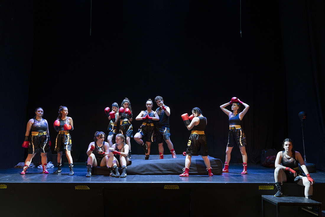 La propuesta de las directoras Nerea Lovecchio y Luna Paredes, con las diez actrices y el actor sin salir del escenario, juega con las luces, con el patio de butacas y con la imaginación del espectador. En un espacio minimalista, vemos el diálogo de una abuela y su nieta, una agresiva entrevista de trabajo de una empresa láctea, un concurso de televisión, una arenga de una mujer que pide “escupir sobre el futuro” o una madre que arrulla a su bebé, entre otros pasajes; sin embargo, son las escenas colectivas las que tensan la cuerda (del cuadrilátero y la de nuestras vidas) y sacude conciencias ante el desilusionante futuro laboral que espera a los jóvenes que llevan el cántaro de leche sobre sus cabezas.