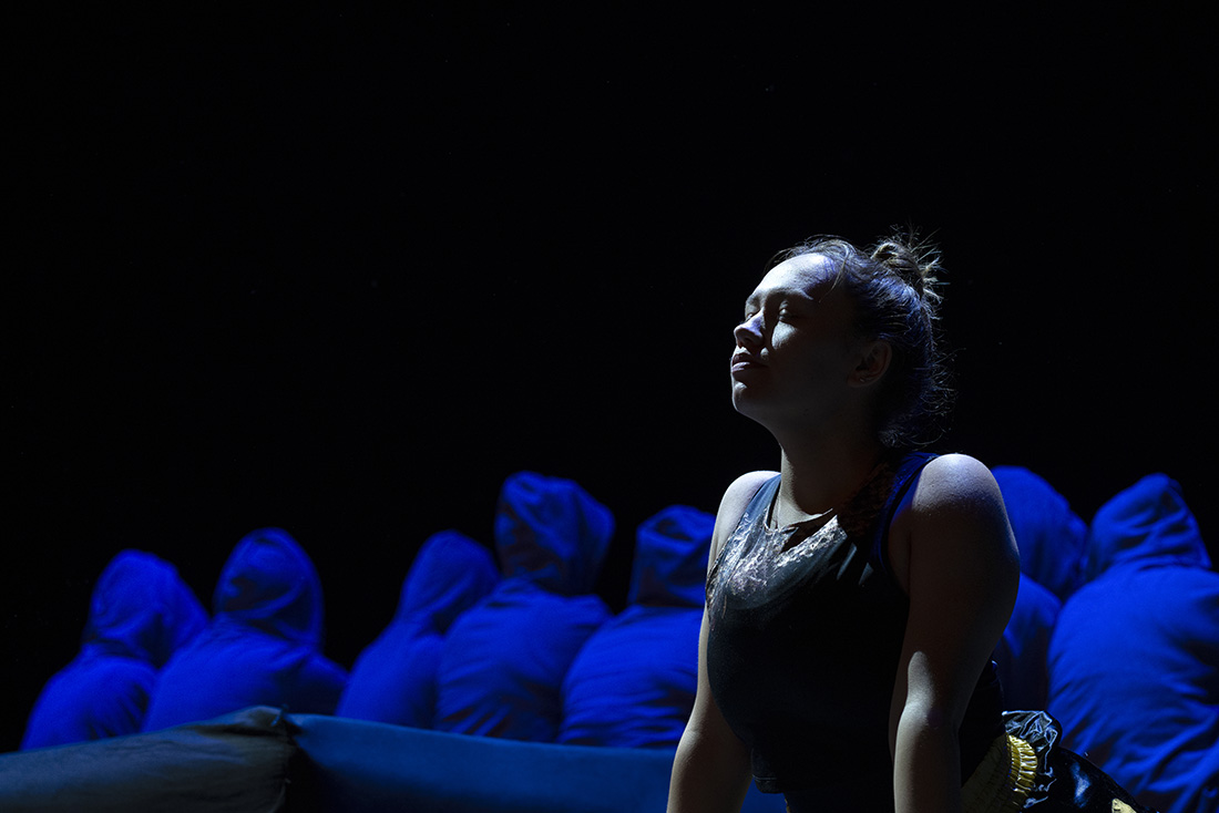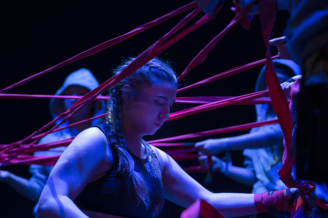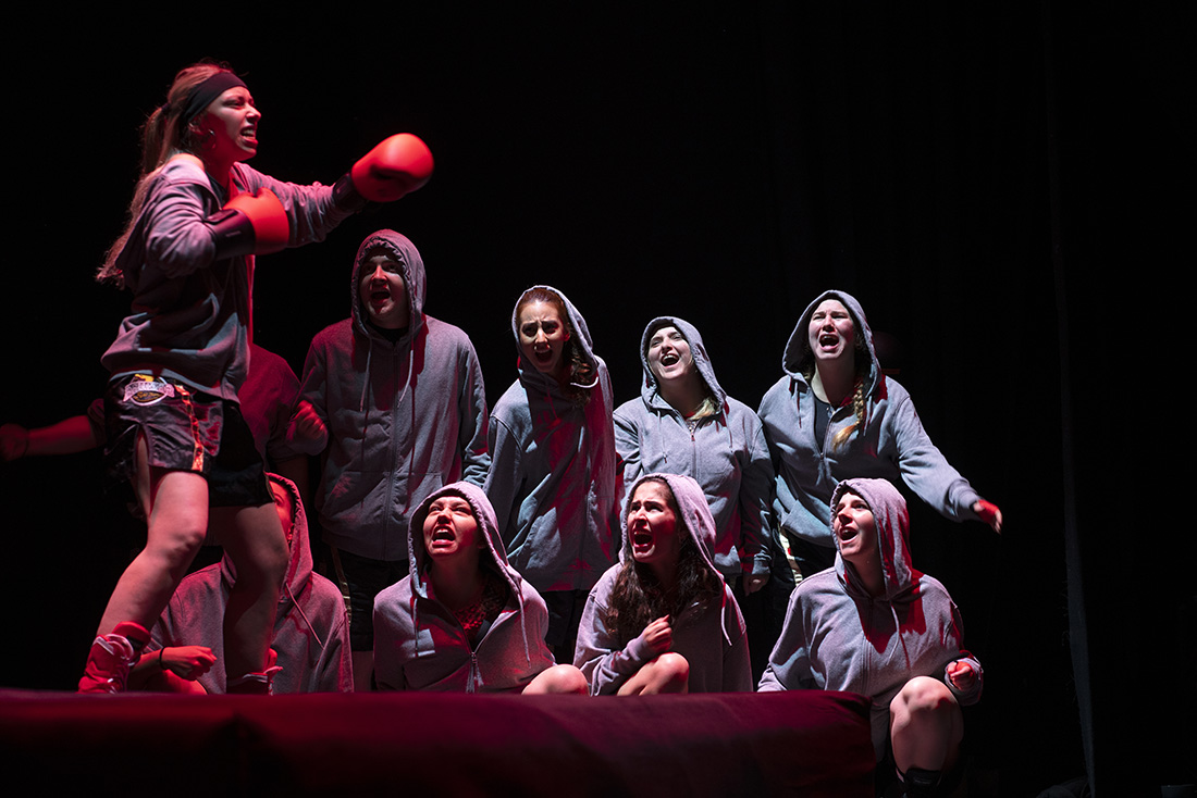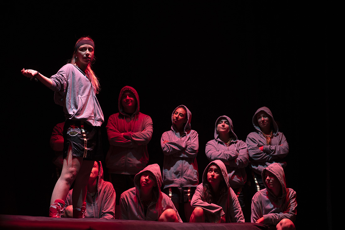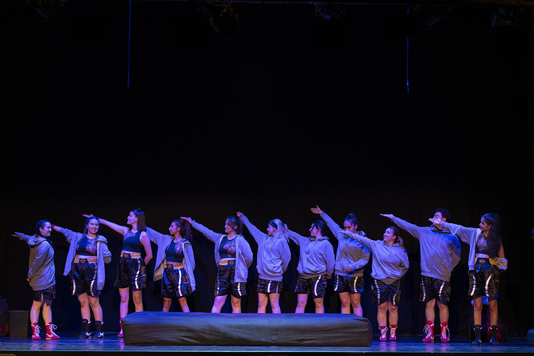 La propuesta de las directoras Nerea Lovecchio y Luna Paredes, con las diez actrices y el actor sin salir del escenario, juega con las luces, con el patio de butacas y con la imaginación del espectador. En un espacio minimalista, vemos el diálogo de una abuela y su nieta, una agresiva entrevista de trabajo de una empresa láctea, un concurso de televisión, una arenga de una mujer que pide “escupir sobre el futuro” o una madre que arrulla a su bebé, entre otros pasajes; sin embargo, son las escenas colectivas las que tensan la cuerda (del cuadrilátero y la de nuestras vidas) y sacude conciencias ante el desilusionante futuro laboral que espera a los jóvenes que llevan el cántaro de leche sobre sus cabezas.