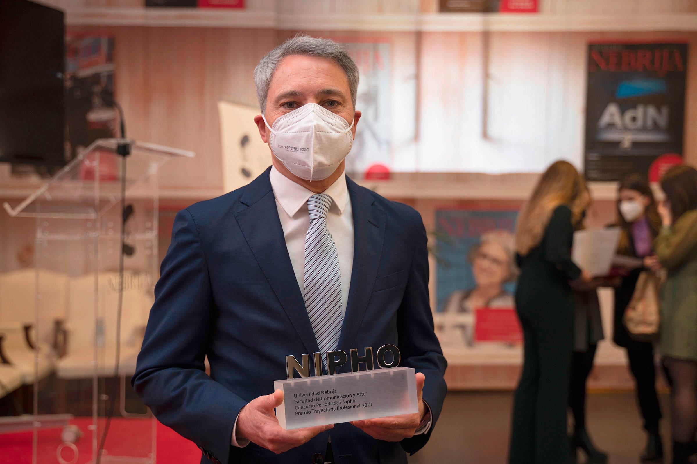 “El periodismo no es solo contar el qué, sino también el porqué y el para qué. Los periodistas deben analizar las noticias, esto es lo que podemos aportar de calidad. Donde hay carencia de análisis, no hay libertad”. Este fue uno de los conceptos que Vicente Vallés, director y presentador de la segunda edición de Antena 3 Noticias, verbalizó desde el estrado del salón de actos de la Universidad Nebrija tras recibir el Premio NIPHO Trayectoria Profesional. Los galardones NIPHO, que cumplen doce años están organizados por el Departamento de Comunicación de la Facultad de Comunicación y Artes.