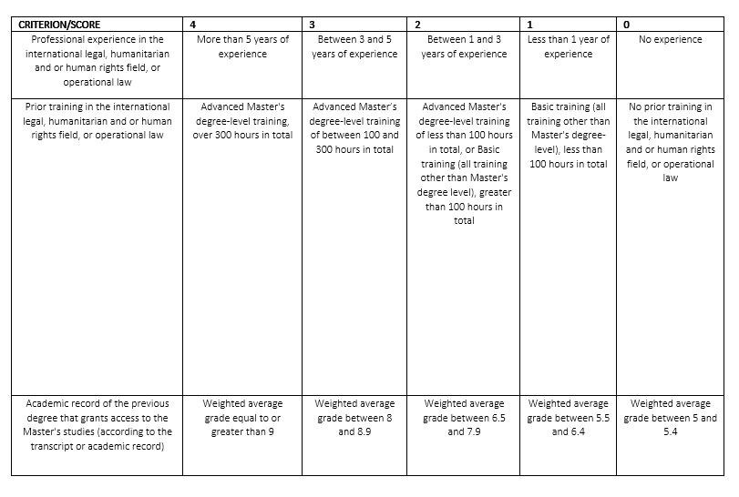 In the event of a tie, preference will be given to those students who have the highest score in professional experience in the international legal, humanitarian and human rights fields, or operational law, according to the criteria established for professional experience in the previous table (Table 4.1). In case of another tie, preference will be given to the student with the best weighted average grade in the academic record of the previous degree that grants access to the Master's studies.