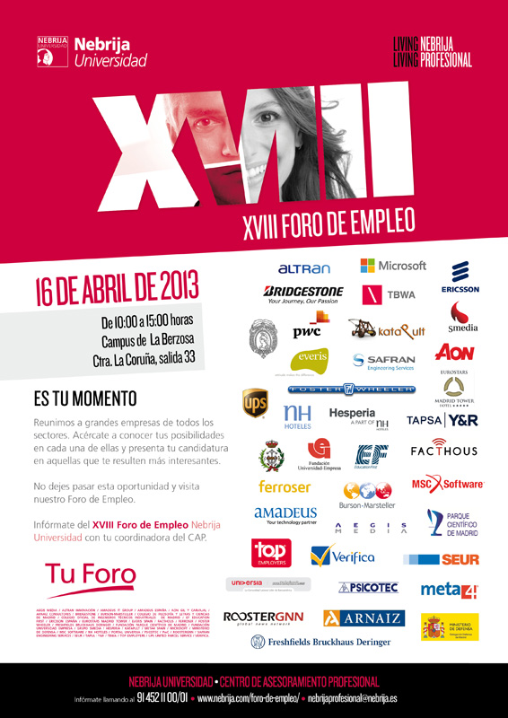 El Centro de Asesoramiento Profesional de la Universidad Nebrija celebró el XVIII Foro de Empleo “Nebrija Profesional” el 16 de abril de 2013 en el Campus de La Berzosa, facilitando el contacto entre las empresas en búsqueda de talento y nuestros alumnos y antiguos alumnos.