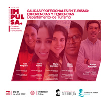 En el marco de las Jornadas de Empleabilidad IMPULSA Nebrija, contamos con la presencia de cuatro Alumni de nuestro grado en Turismo, que cuentan su experiencia laboral luego de terminar el grado en Nebrija, y con Xavier Aizcorbe, Head of Client Success de Turijobs, principal portal de empleo especializado en Turismo, que nos habla sobre las principales tendencias y ofertas laborales en el sector.