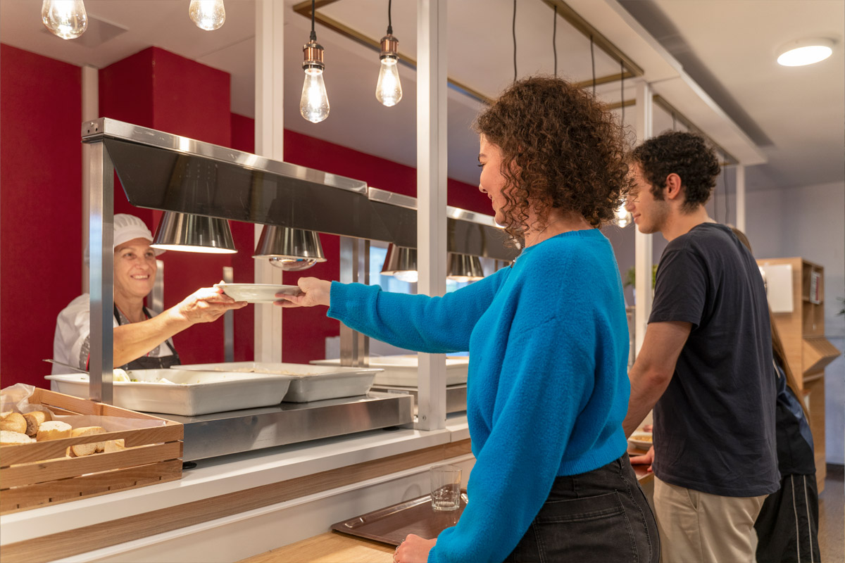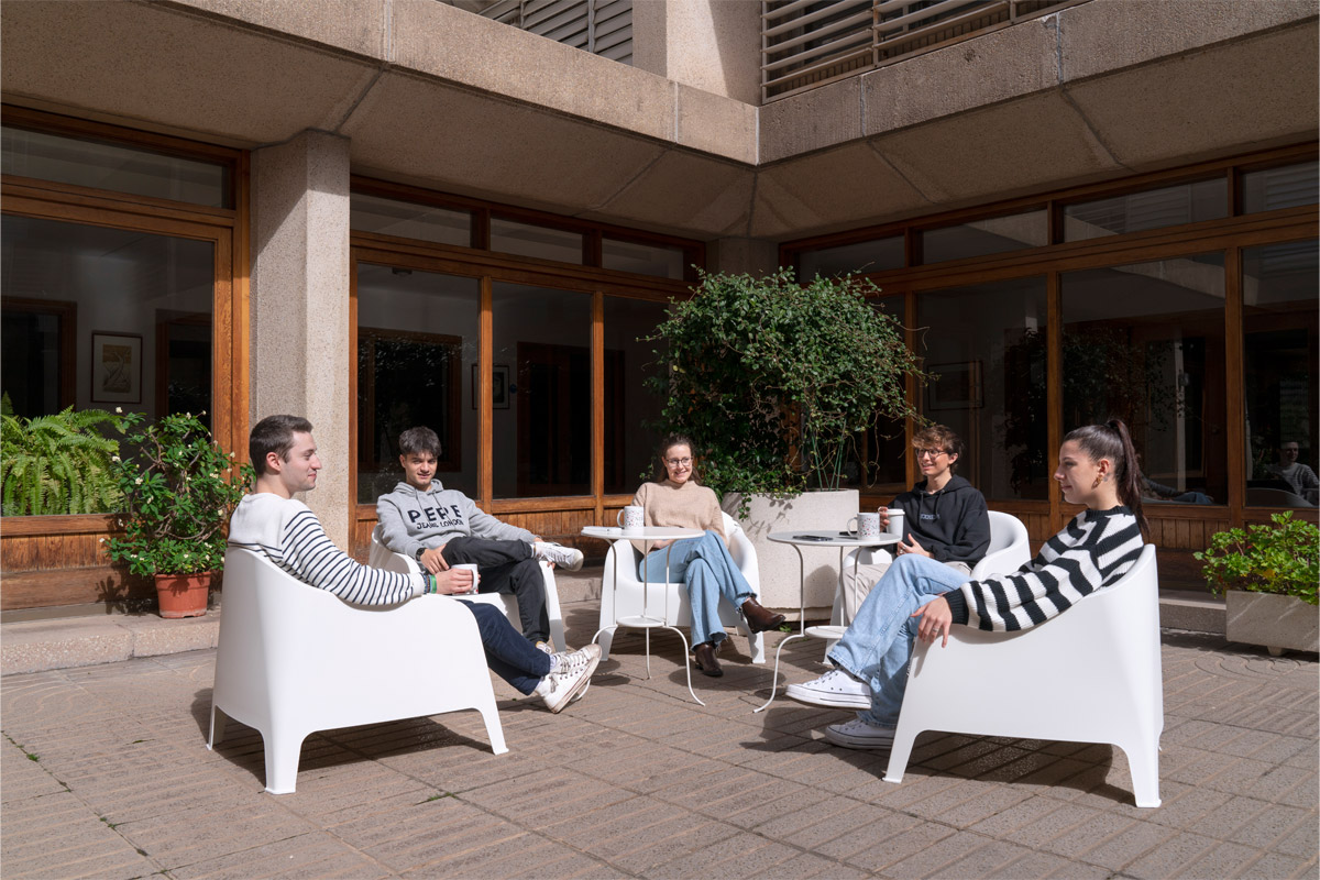 Espacios dinámicos y acogedores con todo lo que necesitas para el estudio (biblioteca, salas de trabajo y servicio de reprografía) y para disfrutar del día a día (comedor, cafetería, salas de estar y de ocio, gimnasio y solárium y amplias zonas ajardinadas).