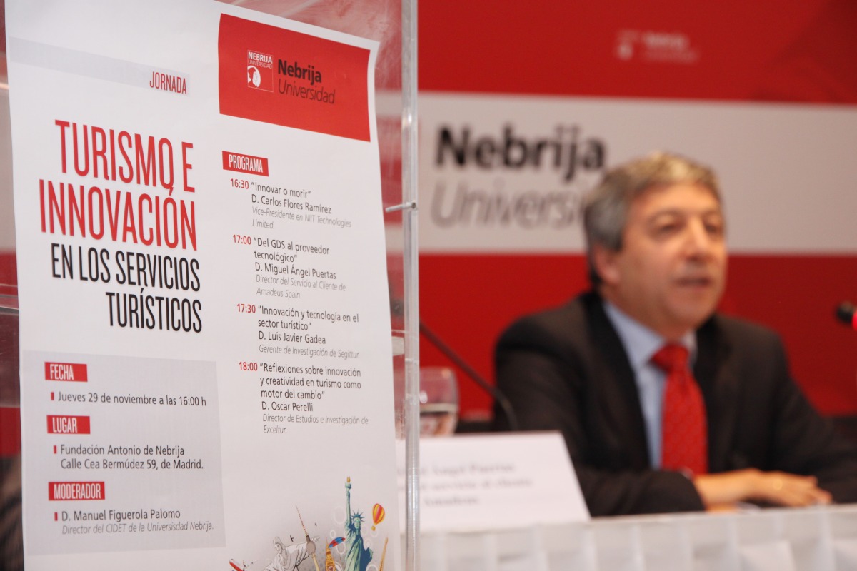 En la jornada, moderada por Manuel Figuerola, director del Centro de Investigación, Desarrollo e Innovación Turística (CIDET) de la Universidad Nebrija, participaron Carlos Flores, vice-presidente en NIIT Technologies Limited, Miguel Ángel Puertas, director del Servicio al Cliente de Amadeus Spain, Luis Javier Gadea, gerente de Investigación de Segittur, y Oscar Perelli, director de Estudios e Investigación de Exceltur.