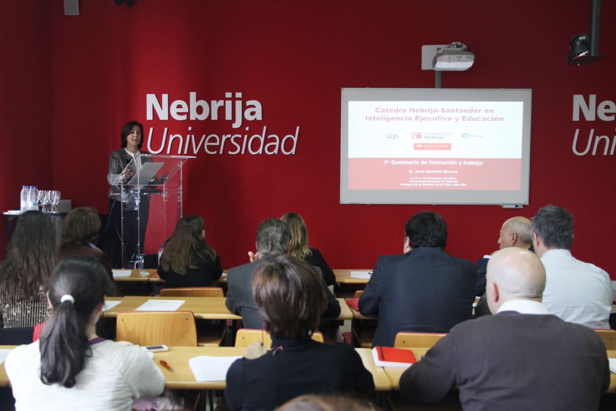 La rectora Mª Pilar Vélez, en la presentación del seminario, explicó que este campo puede ser un buen punto de referencia y posicionamiento para la Universidad Nebrija e insistió que la cátedra no sólo pretende la formación de los participantes sino que también requerirá del trabajo colaborativo de todos. La creación de un modelo pedagógico con base en la inteligencia ejecutiva y su entrenamiento renovaría el sistema docente y contribuiría a una mejor comunicación con el alumno y con la sociedad.