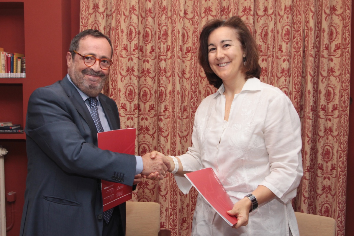 Javier González Ferrari, presidente de Onda Cero, y Mª Pilar Vélez, rectora de la Universidad Nebrija, firmaron el lunes 12 de mayo un convenio para la creación del Máster en Radio Onda Cero.