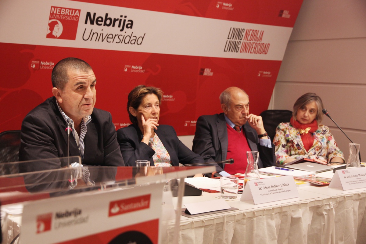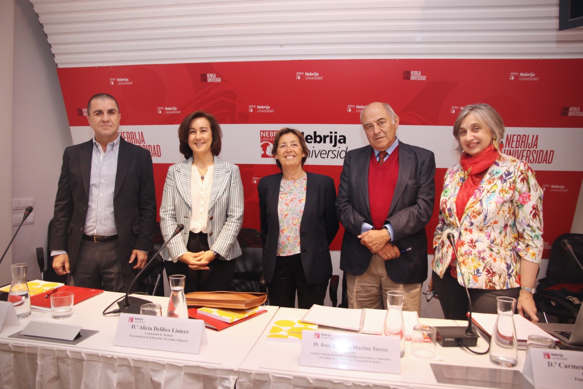 Alicia Delibes, viceconsejera de Educación, Juventud y Deporte de la Comunidad de Madrid, Carlos Marchena, inspector de Educación de la Consejería de Educación, Cultura y Deporte de la Junta de Andalucía, José Antonio Marina, director de la Cátedra Nebrija-Santander en Inteligencia Ejecutiva y Educación y presidente de la Fundación Universidad de Padres, y Carmen Pellicer, presidenta de la Fundación Trilema, acompañaron a los asistentes durante esta jornada.