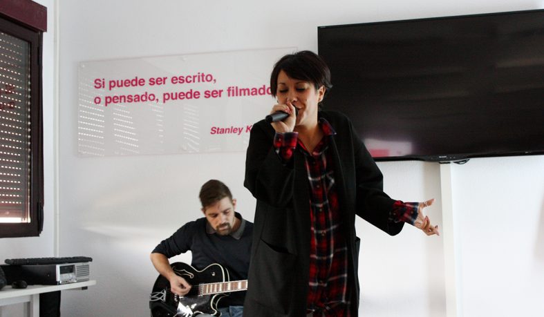 Irene se presentó ante los alumnos con un look rockero, junto a su guitarrista. Sostenía un micrófono. La luz era tenue y las cuerdas de la guitarra eléctrica empezaron a sonar a un ritmo pegadizo. Los alumnos se mantenían en silencio, expectantes… Irene G Punto empezó a recitar su poesía y sus pies se movían al ritmo de la música. Sus micro poemas son sensibles y logran profundizar y captar la atención de todo el mundo.