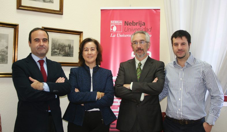 Pilar Vélez, vicerrectora de Investigación y Calidad de la Universidad Nebrija y Evaristo Jiménez, presidente de EC3metrics, firmaron el acuerdo el viernes 21 de noviembre en el Campus de la Dehesa de la Villa. En el acto también estuvieron presentes Álvaro Cabezas, responsable del sexenios.com en EC3metrics, y Álvaro Bustinduy, director de la Oficina de Transferencia de Resultados de Investigación (OTRI) de la Fundación Nebrija.