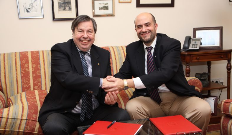 Juan Cayón Peña, rector de la Universidad Nebrija, y Lorenzo Navarrete Moreno, decano del Colegio de Politólogos y Sociólogos de Madrid firmaron un convenio para la colaboración entre ambas instituciones. La firma del acuerdo se celebró el jueves 12 de febrero en la Fundación Antonio de Nebrija.