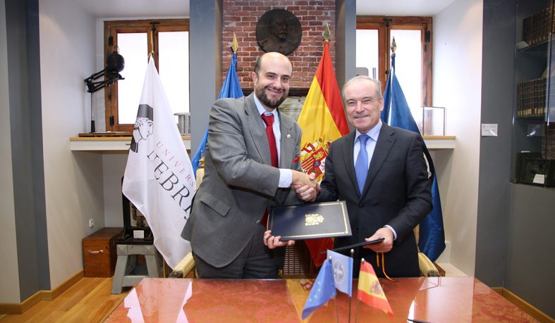 Juan Cayón, rector de la Universidad Nebrija, e Ignacio Azqueta Ortiz, director general del Instituto Nacional de Técnica Aeroespacial “Esteban Terradas”, firmaron el convenio el miércoles 25 de febrero.
