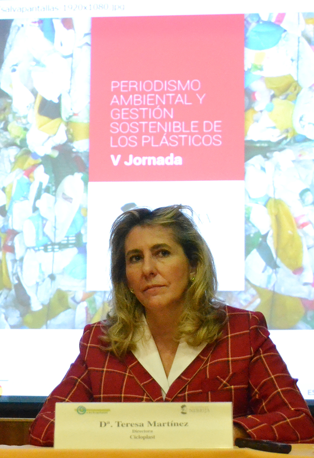 La directora de Cicloplast indicó: “Las jornadas responden al deseo conjunto de informar y formar a la sociedad sobre la correcta gestión ambiental para alcanzar la sostenibilidad”. Dirigiéndose a los alumnos presentes, Teresa Martínez recordó que “el Conocimiento es la mejor base para lograr un victorioso desarrollo profesional” y que una de las especializaciones más interesantes en el ámbito del periodismo era precisamente la enfocada a la escena medioambiental. “En este acto aunamos el esfuerzo de la Academia, del mundo de la empresa y de los medios de comunicación en la difusión del reciclado de plásticos, lo que contribuye al desarrollo sostenible y a la mejora de la calidad de vida de las personas”, manifestó.