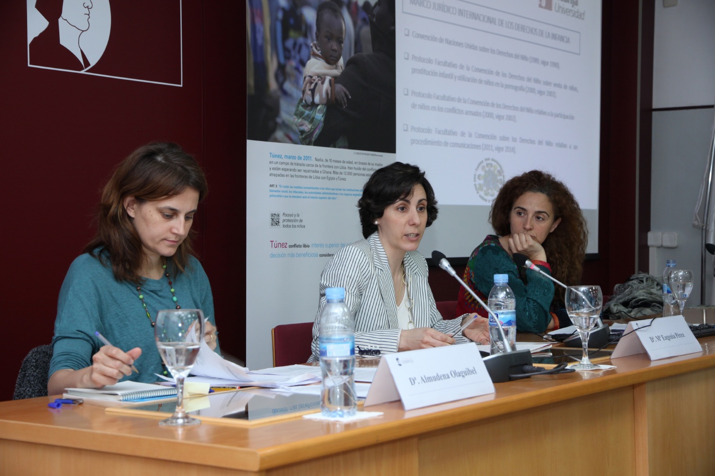 La jornada comenzó con una mesa redonda moderada por la profesora Mª Eugenia Pérez Montero. Según explicó, se estima que cerca de 300.000 niños participan en guerras y muchos de ellos son reclutados a la fuerza para que luchen en conflictos armados.