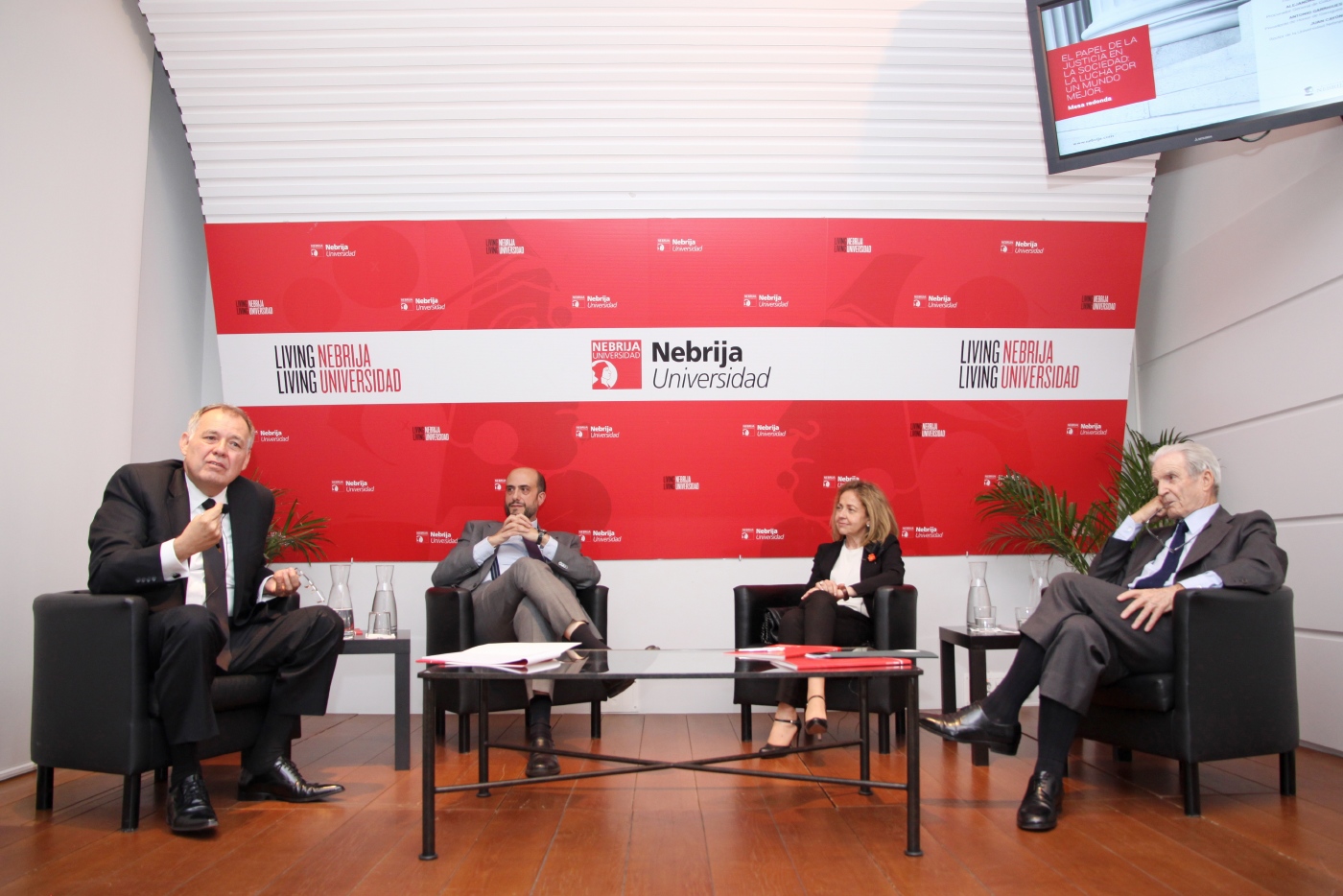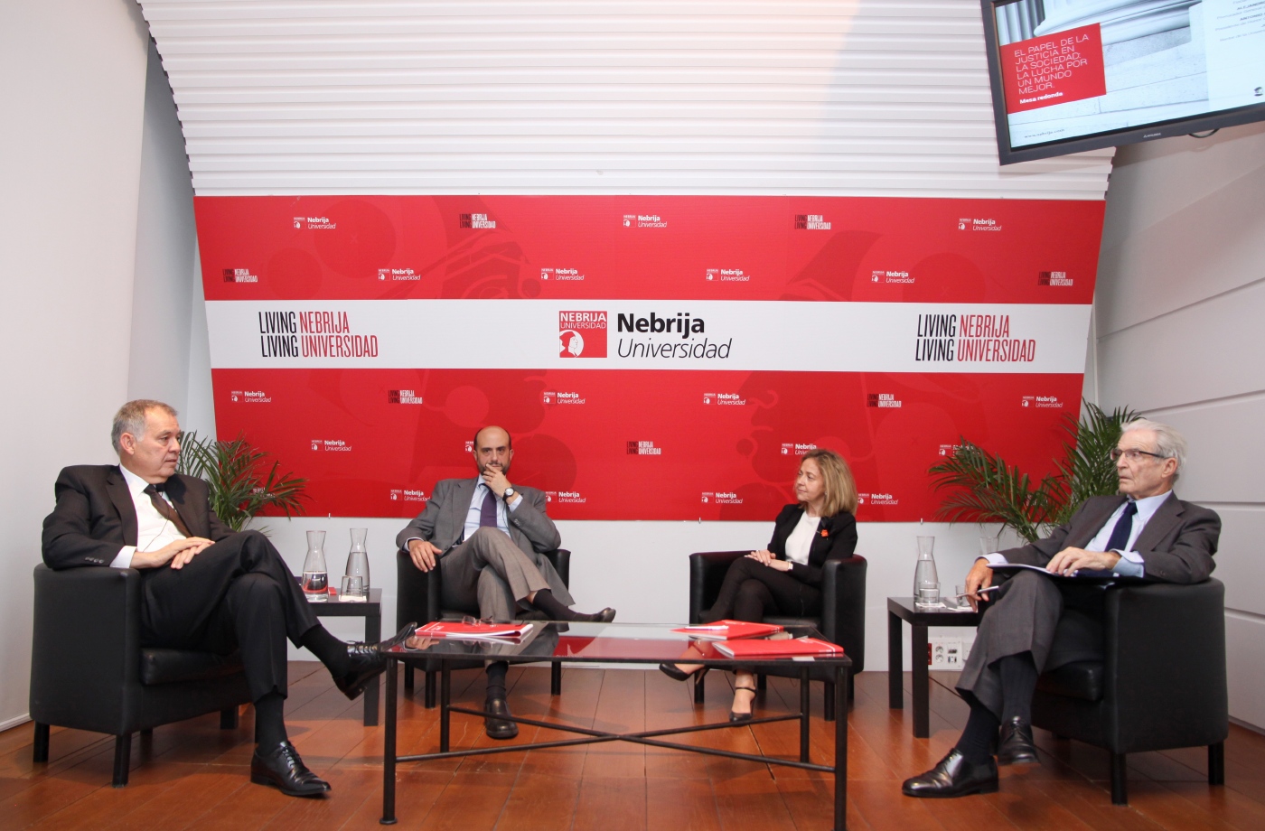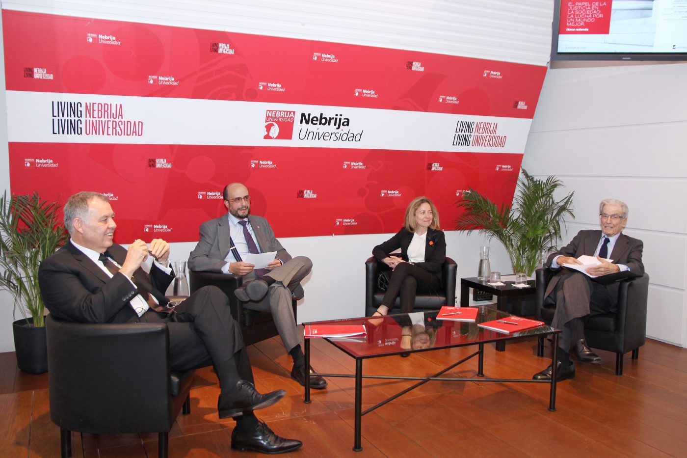 La relación entre la justicia y el derecho ha sido una de las cuestiones objeto de debate en la mesa redonda organizada este miércoles 27 de mayo por la Universidad Nebrija y en la que han participado Consuelo Madrigal, fiscal general del Estado; Alejandro Ordóñez, procurador general de Colombia; y Antonio Garrigues, presidente de honor de Garrigues, moderados por el rector de la Universidad, Juan Cayón.