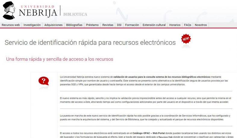 La Universidad Nebrija estrena nuevo sistema de validación de usuarios para la consulta externa de los recursos bibliográficos electrónicos mediante identificación simple por nombre de usuario y contraseña. Este sistema se presenta como alternativa a la identificación segura de usuarios provista por las pasarelas SGD y VPN, que garantizaba desde hacía tiempo el acceso desde el exterior de los campus universitarios.