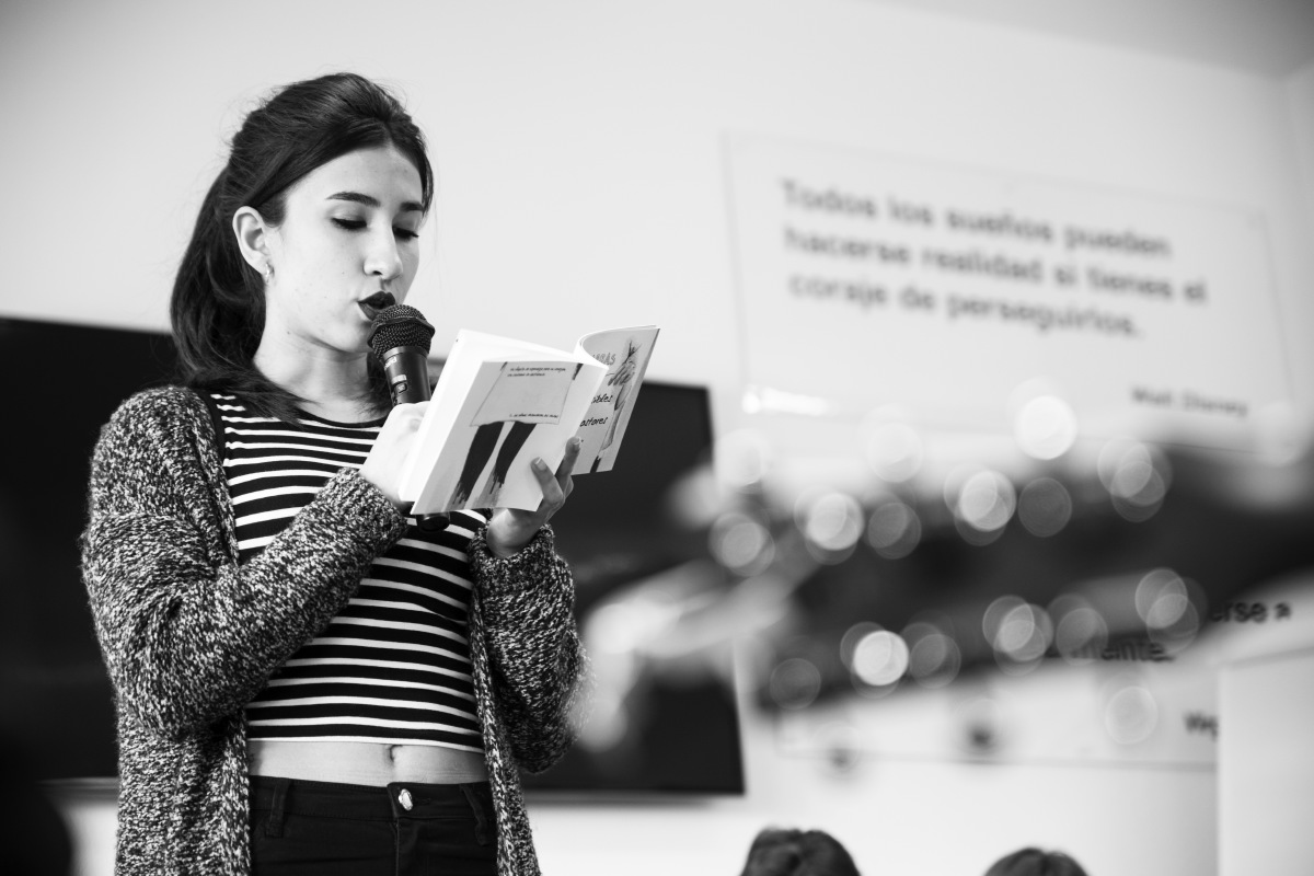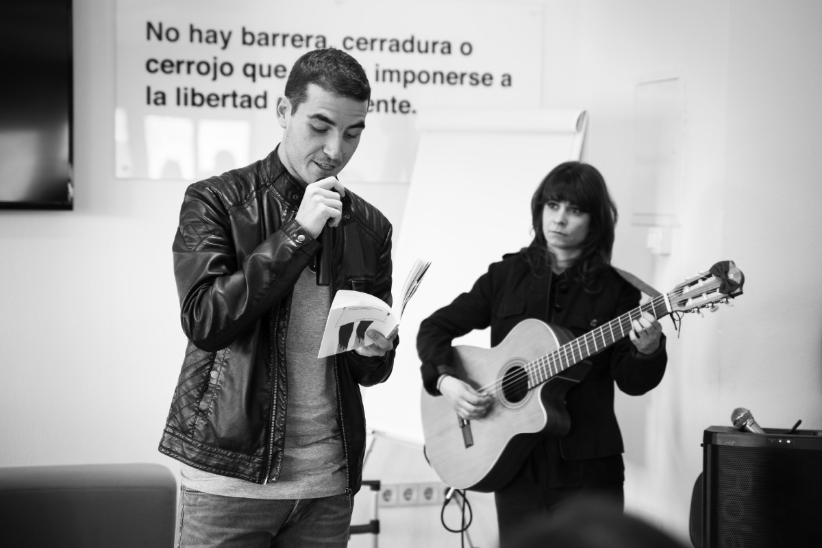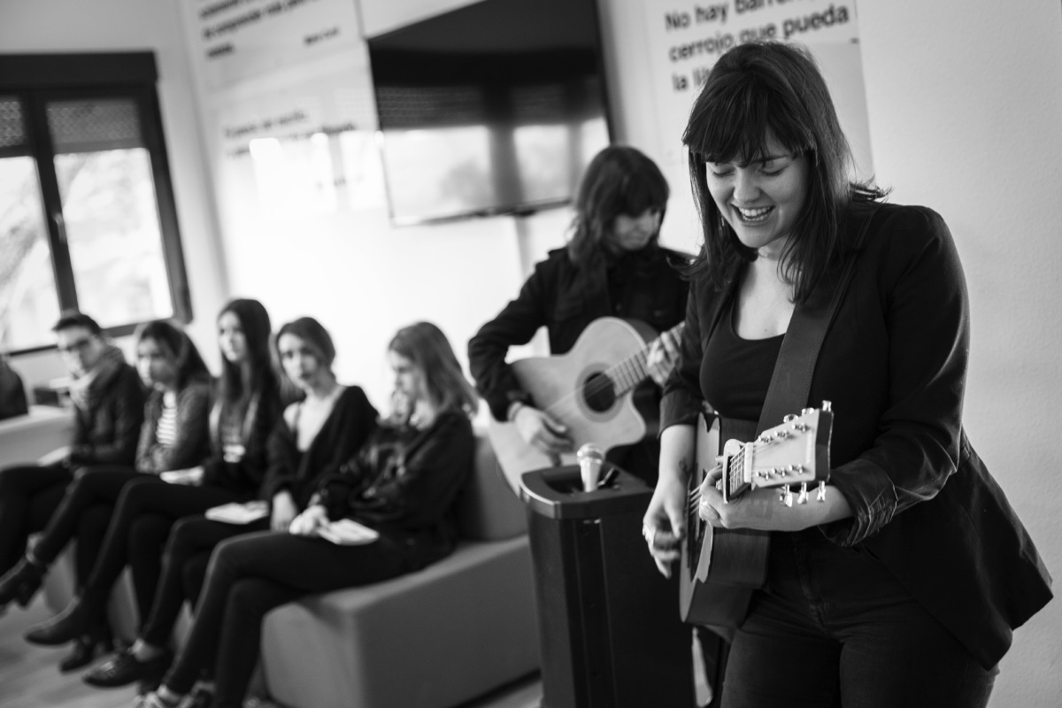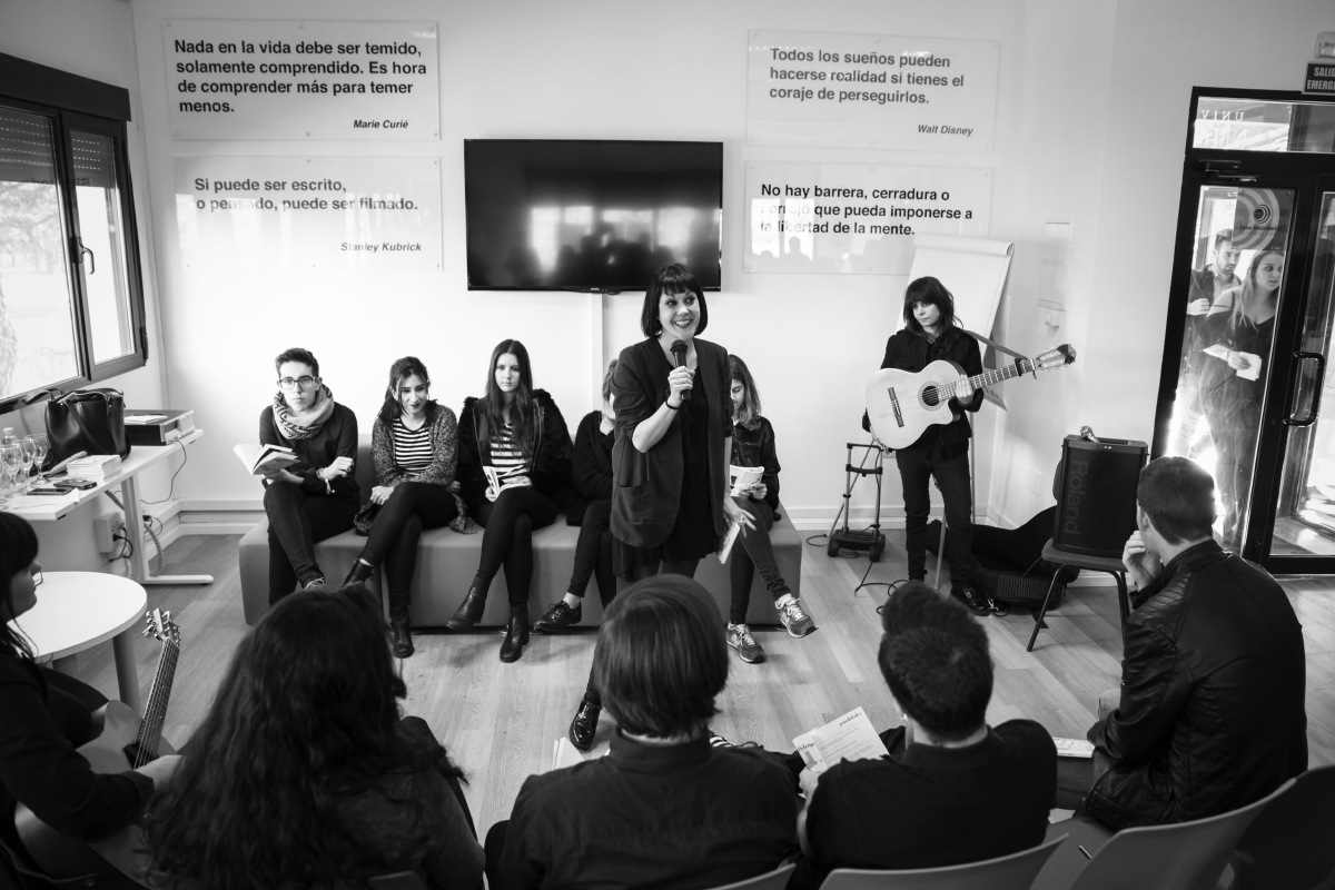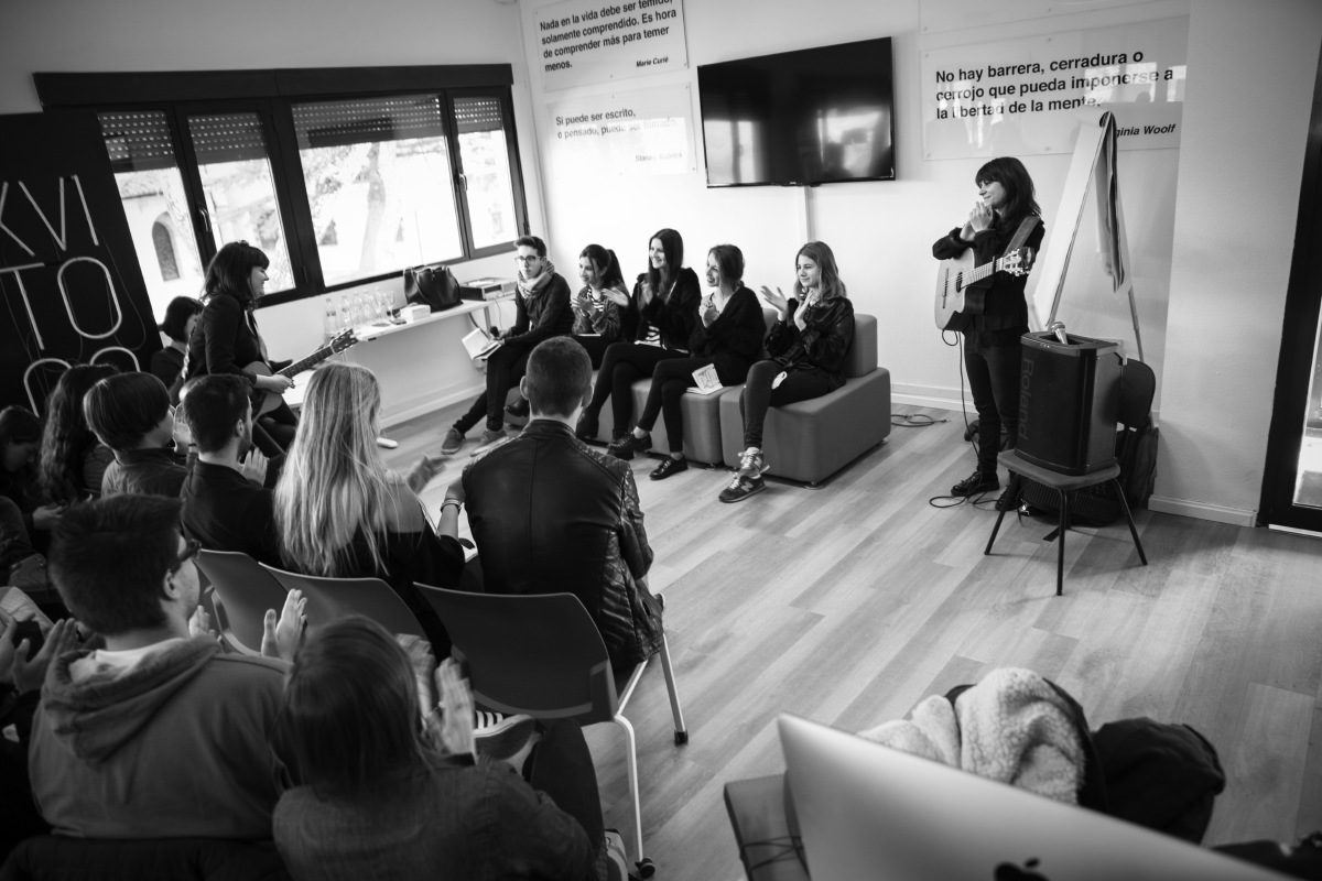 “En mi mar solo hay un pez y está pensando en mudarse”, “Entiende que mis sueños pesan muchísimo, de ahí la forma de mi almohada”, “Nos quisimos a muerte y acabamos matando todo lo que queríamos”, “Caer en las alturas de inexorables críticas y amaneradas virtudes”… Los alumnos, uno por uno, fueron leyendo sus textos, poesías, microrrelatos, genialidades que recordaron a las Greguerías de Ramón Gómez de la Serna… Y para acompañar a las palabras, la presentación contó con la colaboración especial de Diana Zahé y Mäbu, dos artistas que pusieron música a esta jornada.