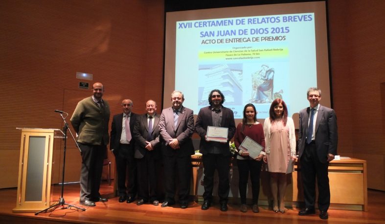 El Centro Universitario San Rafael-Nebrija acogió el miércoles 9 de marzo la ceremonia de entrega de premios del XVII Certamen de Relatos Breves San Juan de Dios. El acto estuvo presidido por el hermano Miguel Ángel Varona, superior provincial y presidente del Patronato de la Fundación San Juan de Dios, Carlos Calleja, director del Centro Universitario San Rafael-Nebrija, Juan Cayón, rector de la Universidad Nebrija y Jesús Morillo-Velarde, Gerente del Hospital San Rafael.
