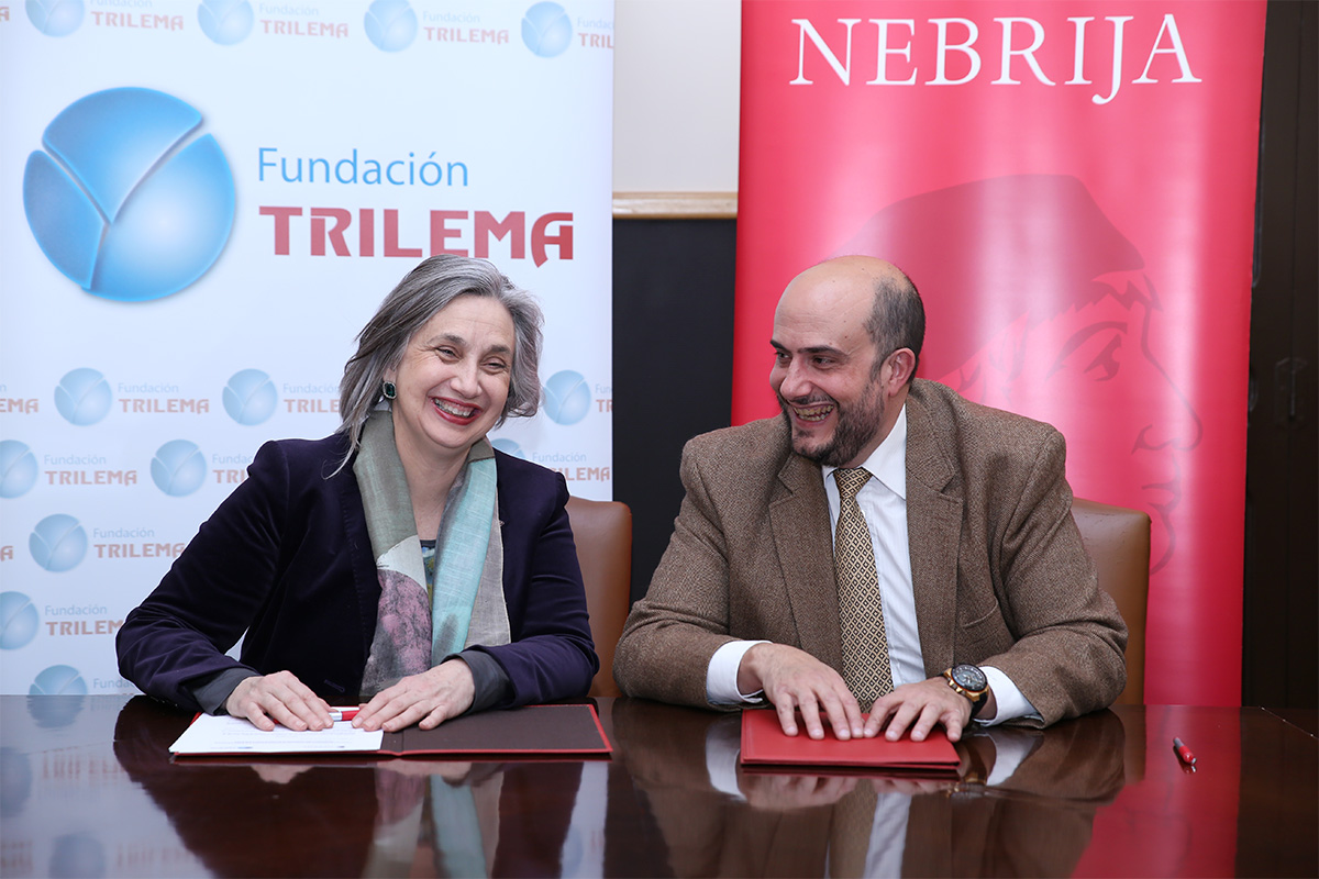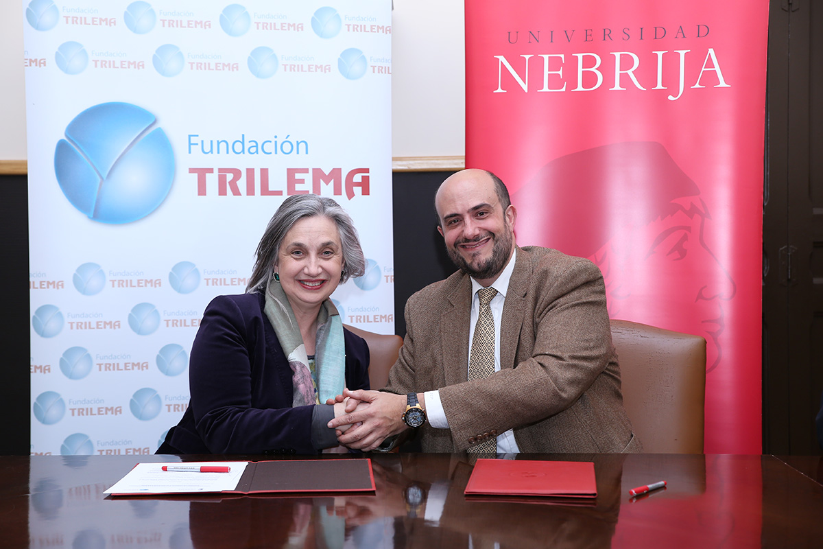 Juan Cayón Peña, rector de la Universidad Nebrija, y Carmen Pellicer Iborra, presidenta de la Fundación Trilema, firmaron el acuerdo el lunes 14 de marzo en el Campus Madrid-Princesa.