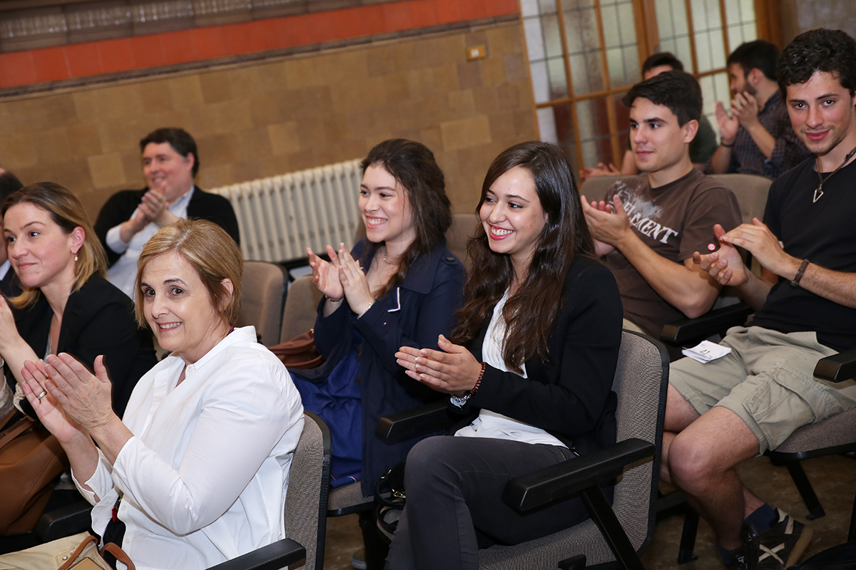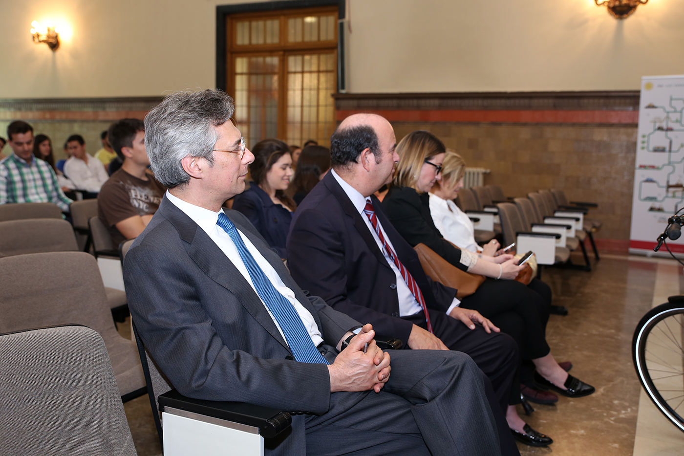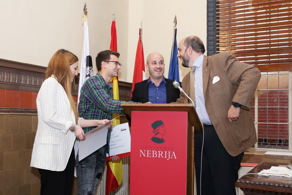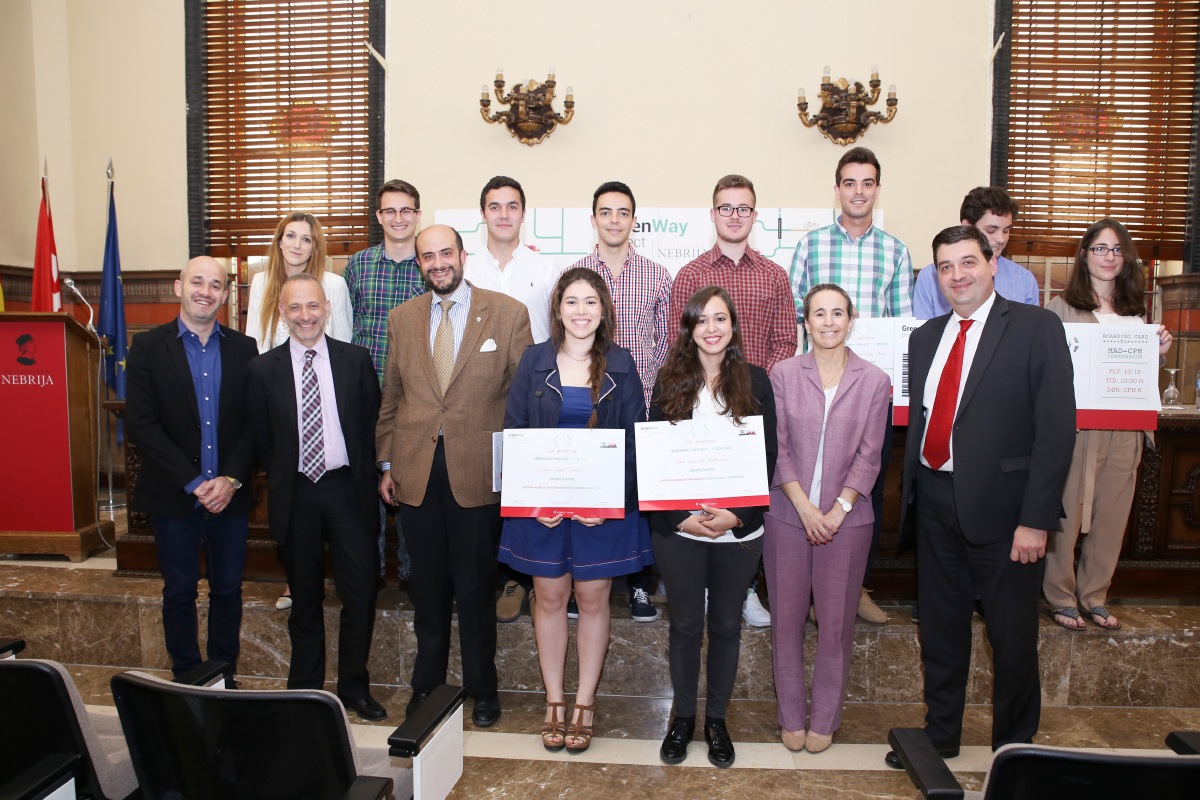 Juan Cayón, rector de la Universidad Nebrija, Lorenzo Sánchez, en representación de la cátedra Santander, Ana Blanco, subdirectora adjunta de la Dirección General de Tráfico y Esteban Meléndez, de Bono Park, participaron en la entrega de premios, celebrada el viernes 20 de mayo en el Campus de la Dehesa de la Villa.