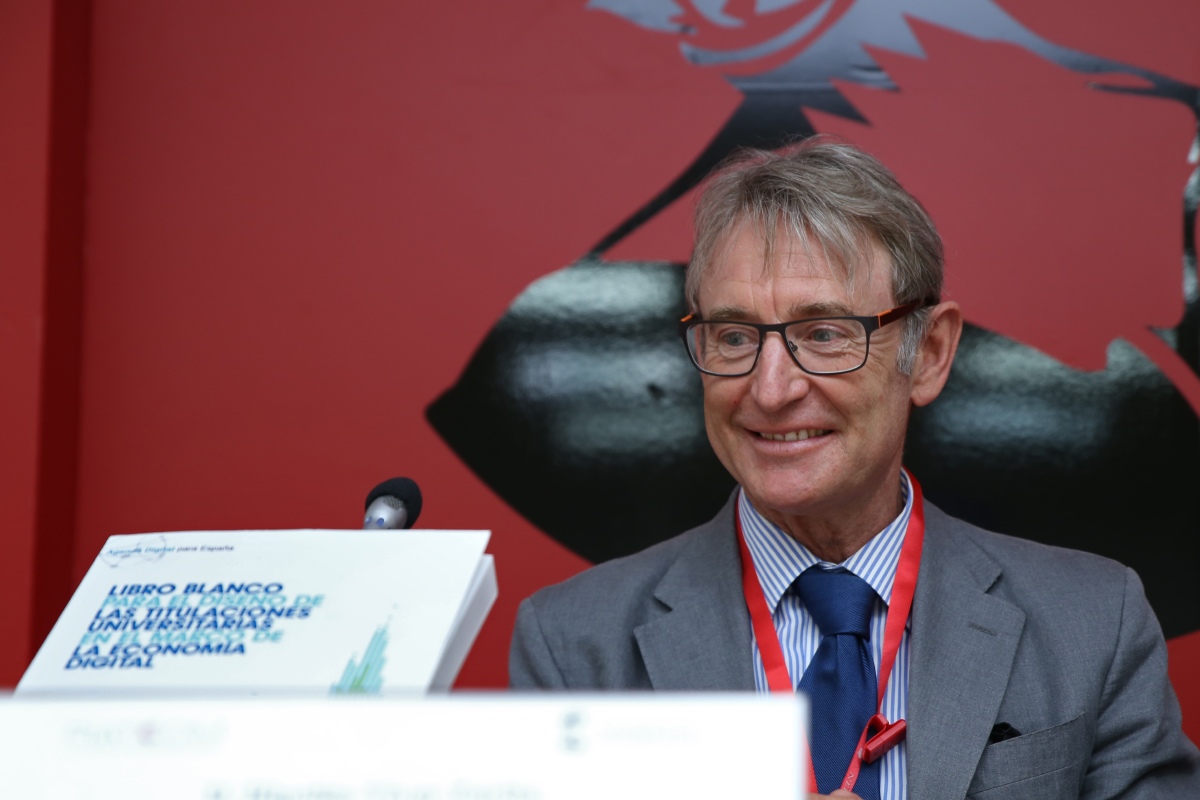 Hipólito Vivar Zurita, catedrático de Comunicación Audiovisual y Publicidad de la Universidad Complutense de Madrid y director del Grupo Estrategia y Gestión de Negocio del Libro Blanco para el diseño de las titulaciones universitarias en el marco de la economía digital, Beningno Lacort Peña, director general de la Asociación de Empresas de Electrónica, Tecnologías de la Información, Telecomunicaciones y Contenidos Digitales (AMETIC), y María del Pilar Bernat Sánchez, profesora asociada en la Facultad de Ciencias de la Comunicación de la Universidad Nebrija, premio de periodismo de la Fundación Vodafone 2013, hablaron sobre El diseño de las titulaciones universitarias en el ámbito digital.