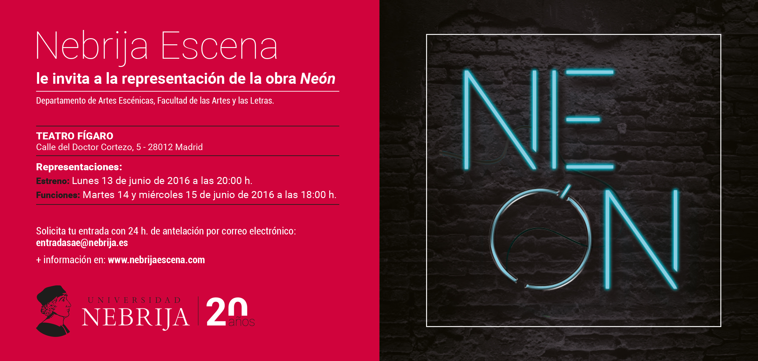 Puedes reservar tus entradas a través del correo entradasae@nebrija.es, con al menos 24 horas de antelación a la representación que desees asistir. En el email es necesario que indiques tu nombre completo y el número de entradas que solicitas. Las invitaciones serán enviadas por correo electrónico para que puedas imprimirlas.