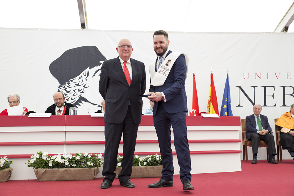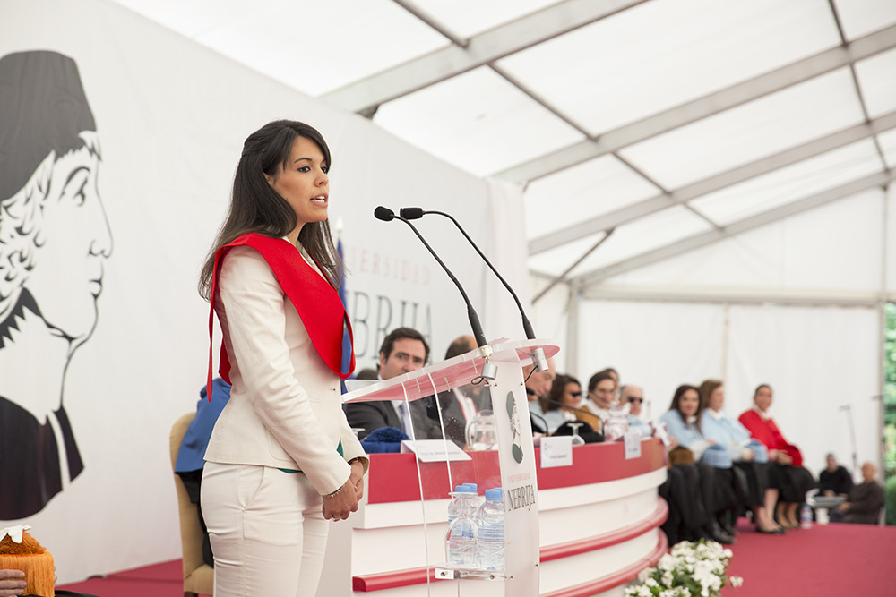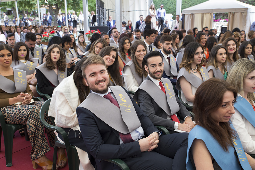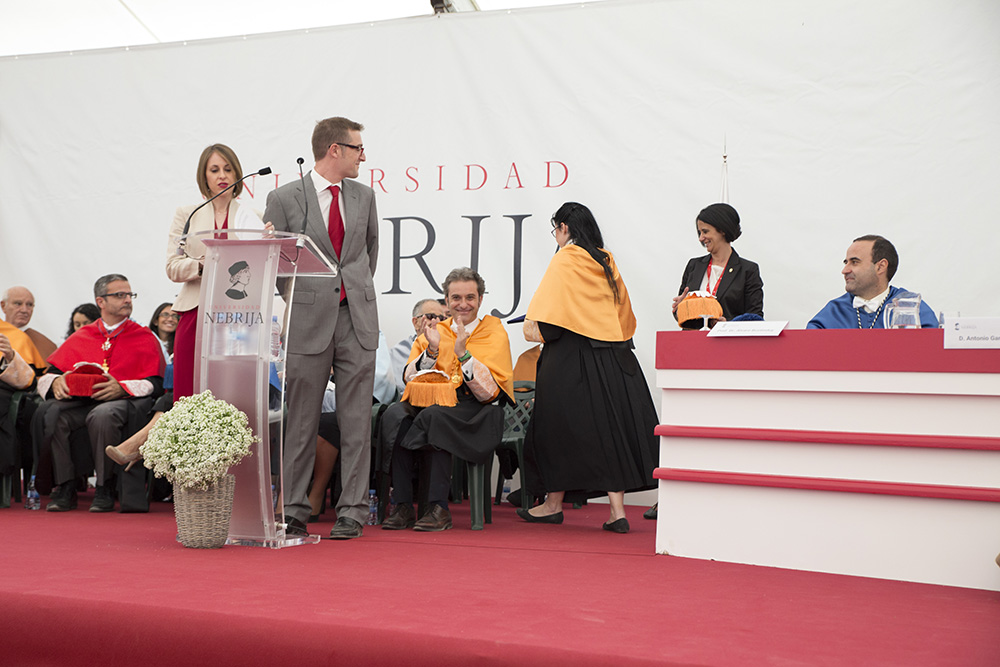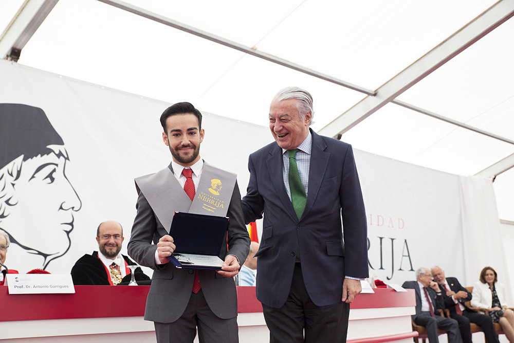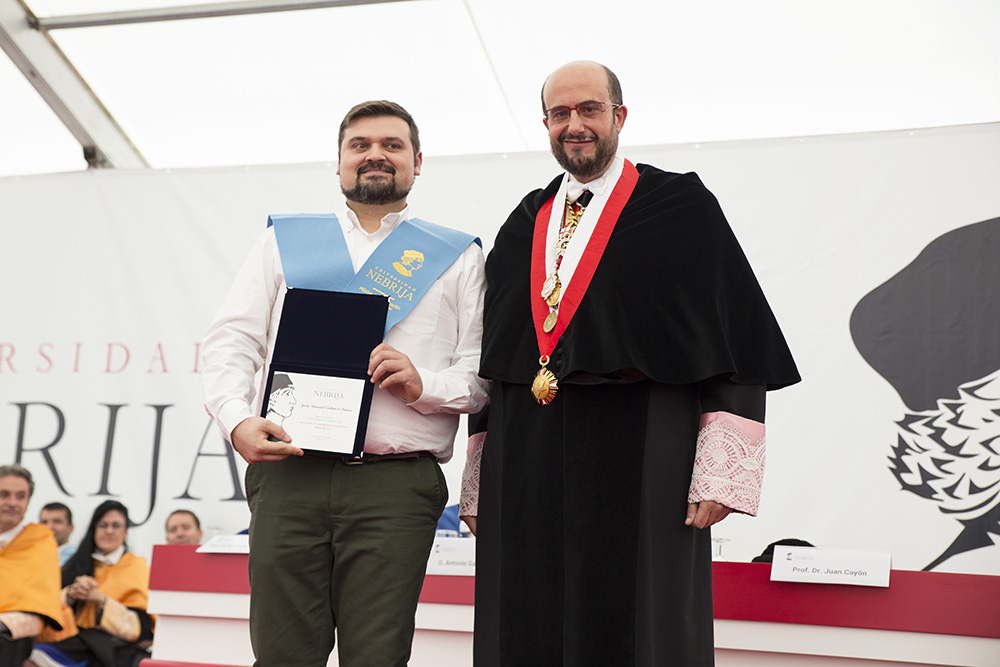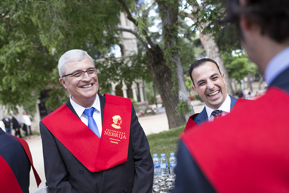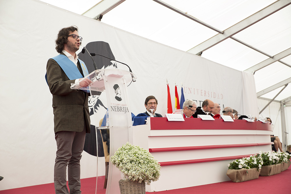Juan Cayón, en su intervención, felicitó a los egresados porque “vuestros esfuerzos han tenido un resultado exitoso” y destacó el trabajo de los profesores, que “han intentado siempre daros lo mejor que tienen”, en su pasión y afán por la docencia y la investigación. Por su parte, Manuel Villa-Cellino, presidente de la Fundación Antonio de Nebrija, reafirmó la importancia de los graduados: “En Nebrija sabemos que el graduado es la piedra angular; lo que os pedimos es que seáis un ejemplo de trabajo profesional y de vitalidad humana”.