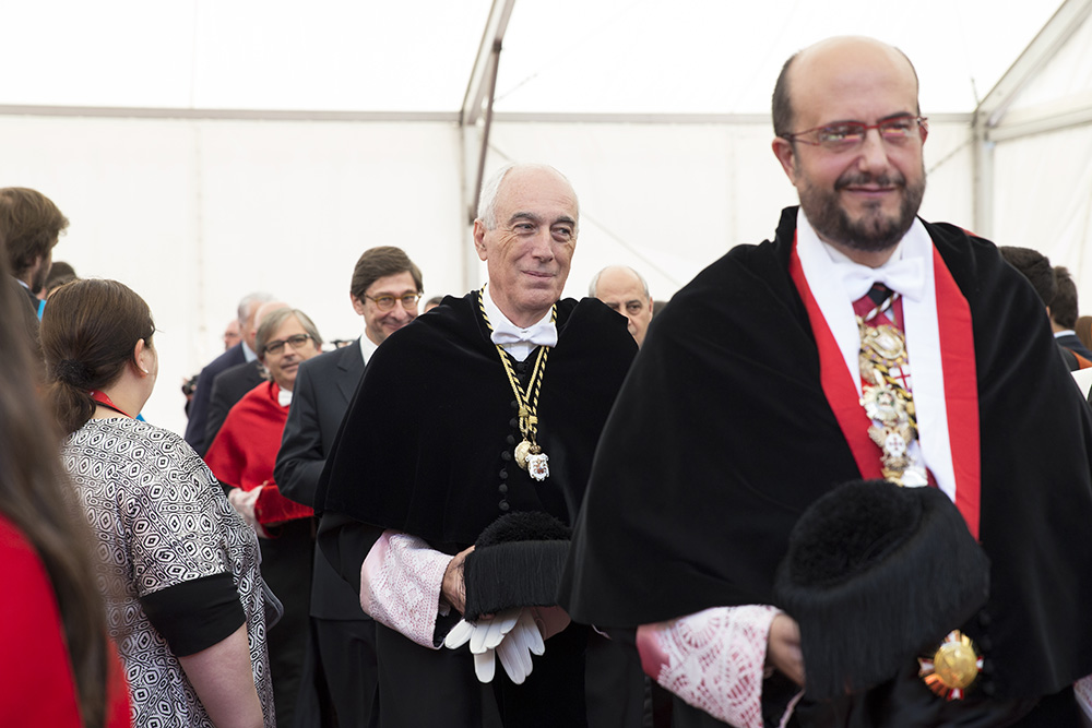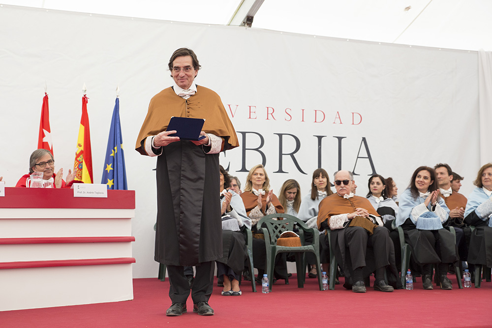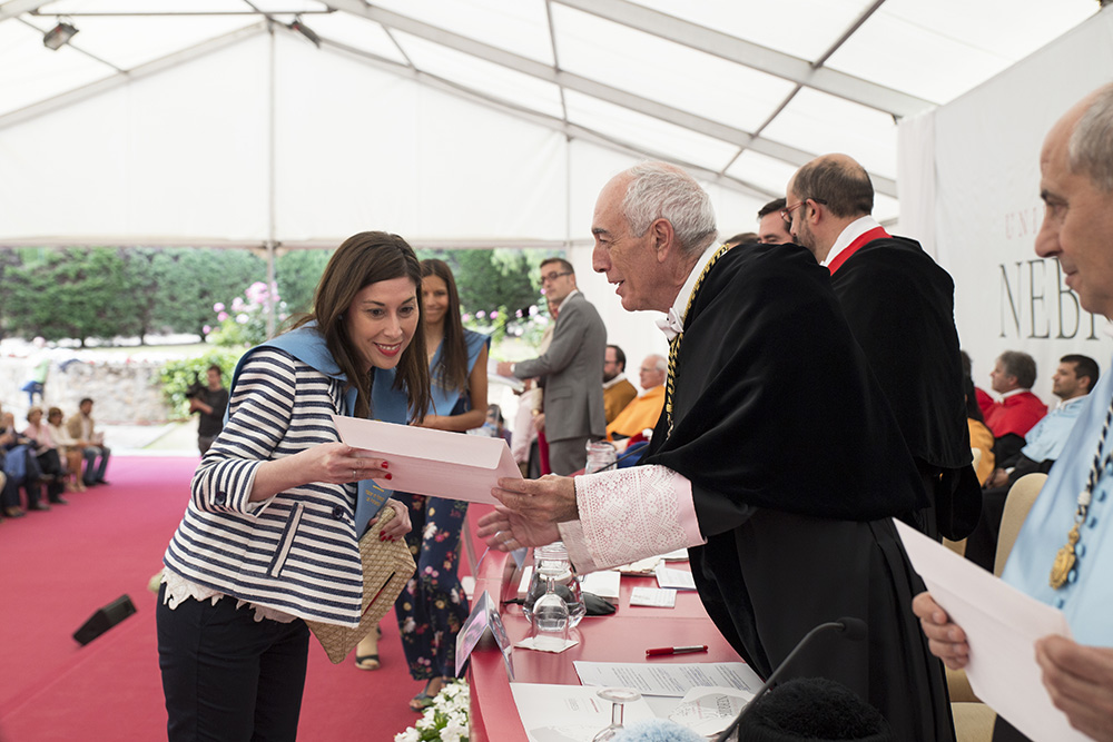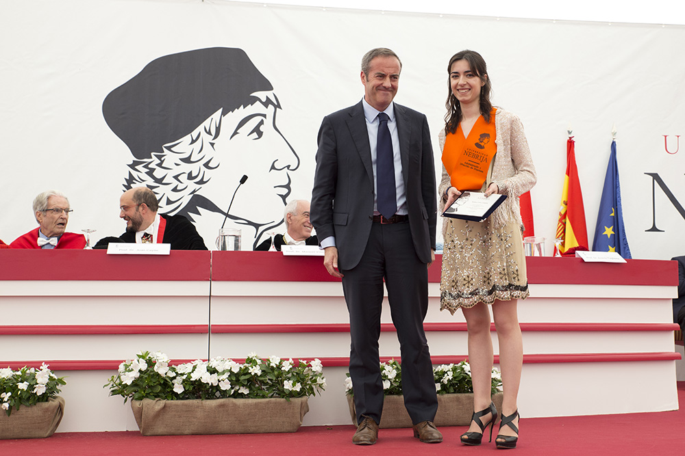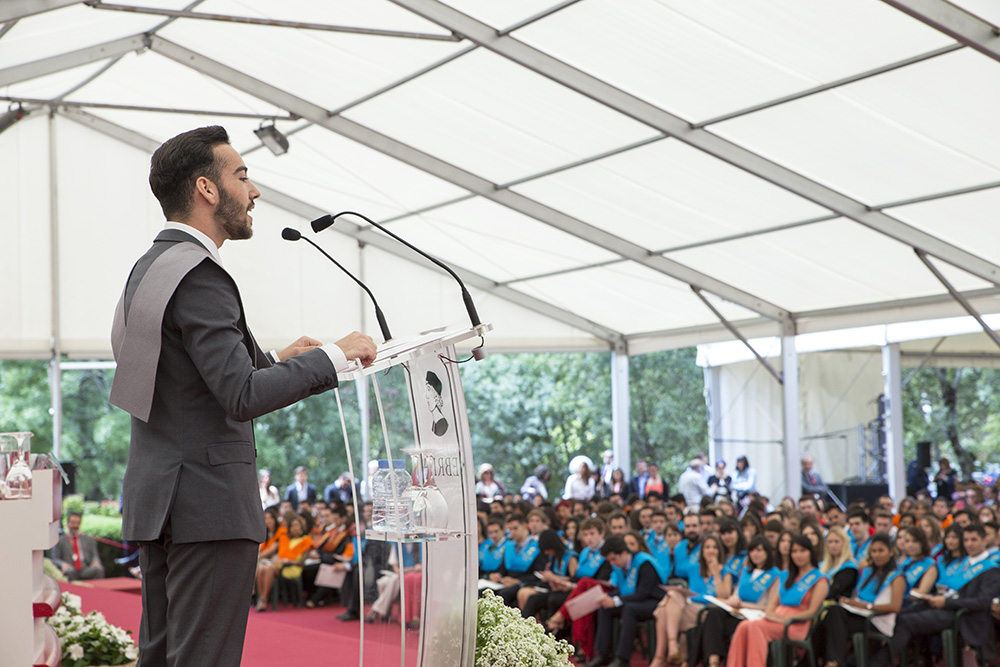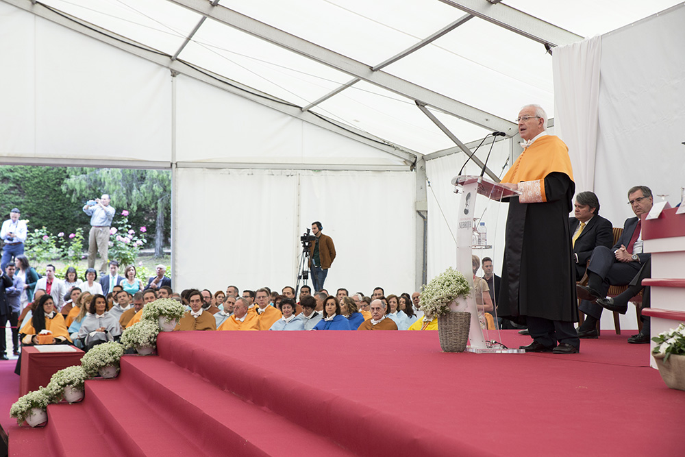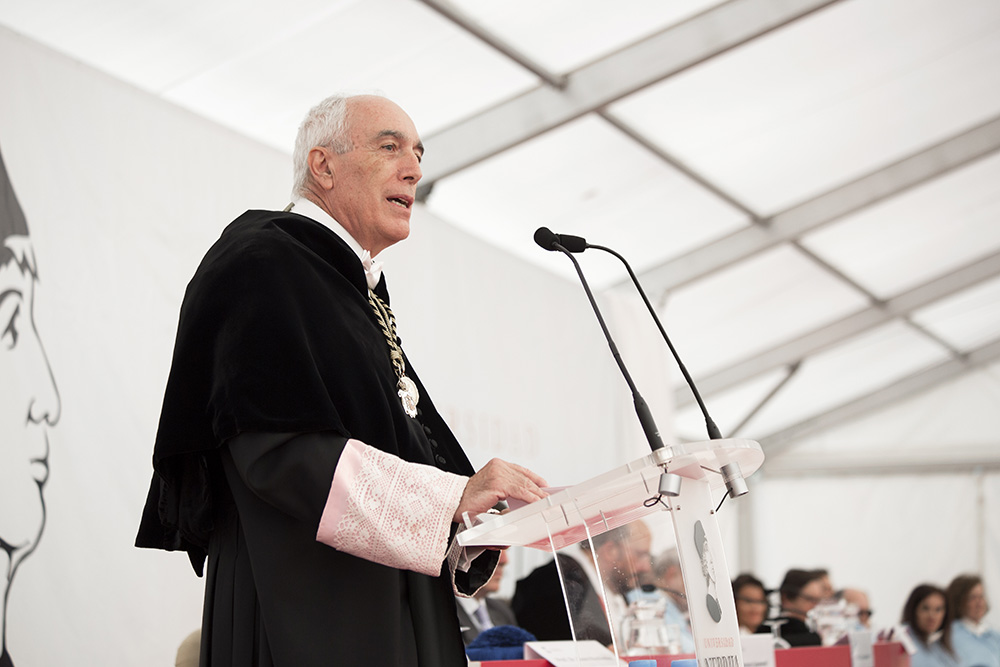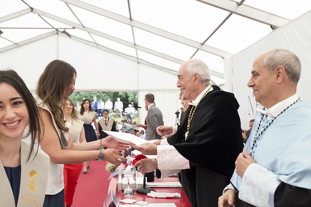 Juan Cayón, en su intervención, felicitó a los egresados porque “vuestros esfuerzos han tenido un resultado exitoso” y destacó el trabajo de los profesores, que “han intentado siempre daros lo mejor que tienen”, en su pasión y afán por la docencia y la investigación. Por su parte, Manuel Villa-Cellino, presidente de la Fundación Antonio de Nebrija, reafirmó la importancia de los graduados: “En Nebrija sabemos que el graduado es la piedra angular; lo que os pedimos es que seáis un ejemplo de trabajo profesional y de vitalidad humana”.