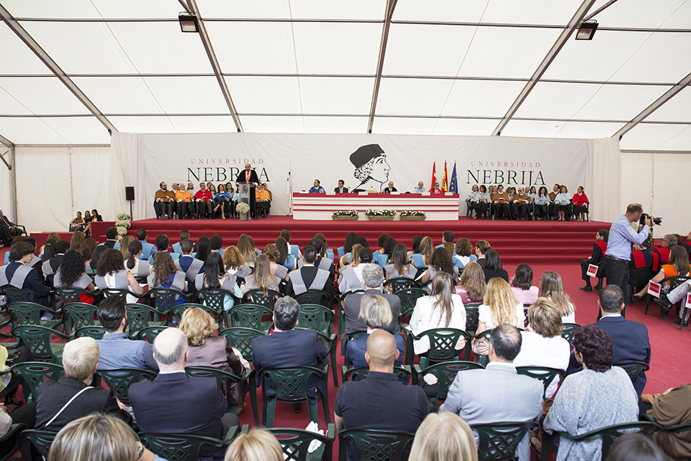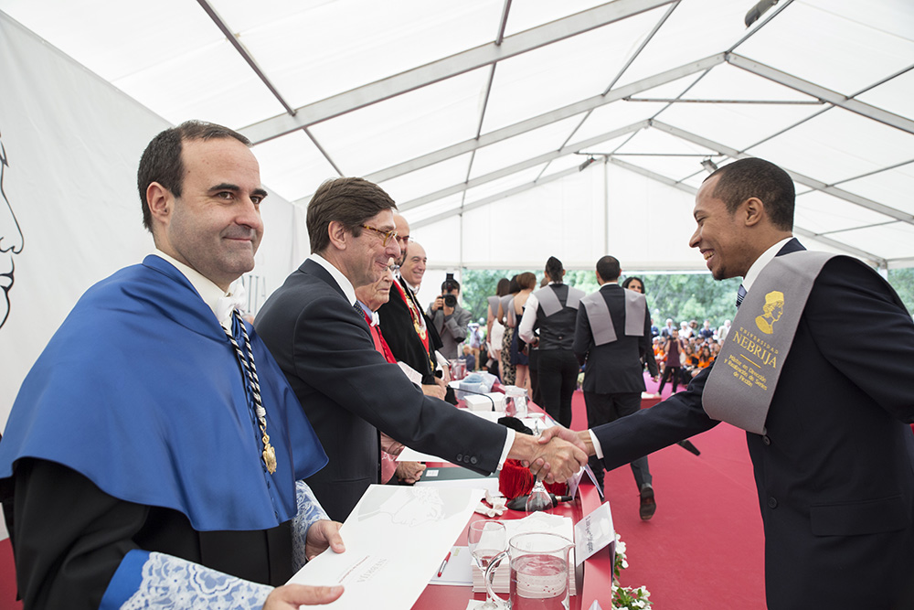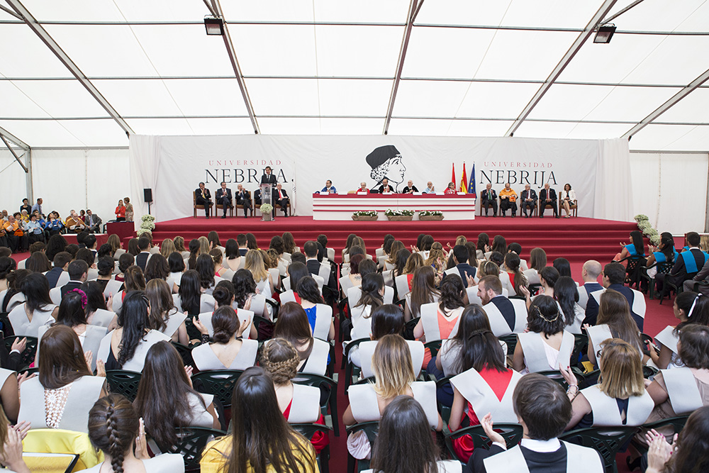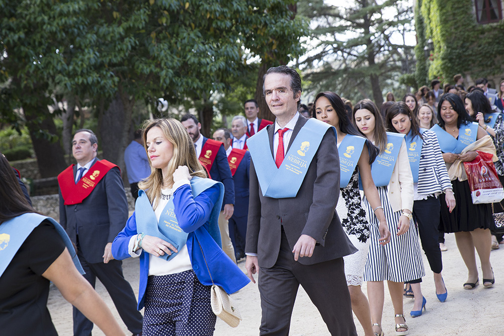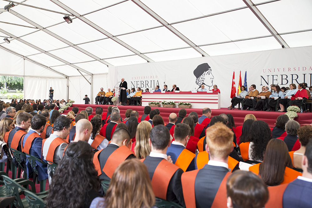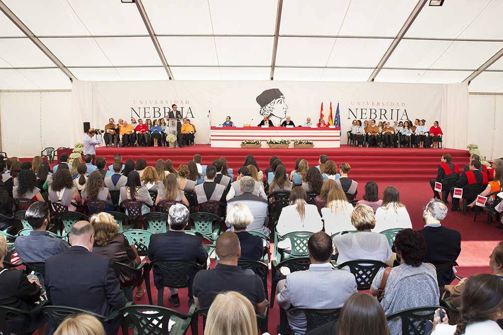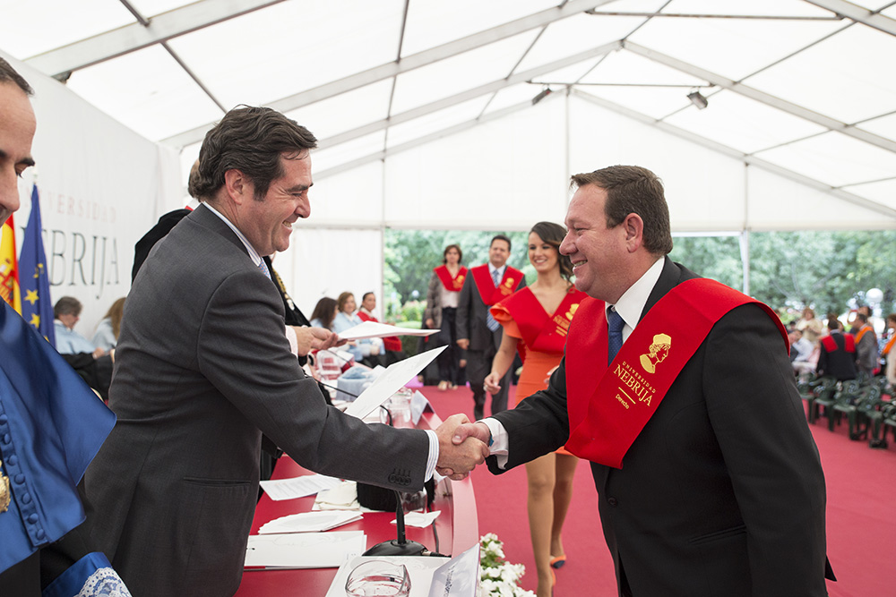 Los padrinos que acompañaron a los alumnos este año fueron José Ignacio Goirigolzarri Tellaeche, presidente de Bankia, en la ceremonia de la mañana y Antonio Garamendi Lecanda, presidente de la Confederación Española de la Pequeña y Mediana Empresa (CEPYME), en el acto celebrado por la tarde. Los dos actos de graduación comenzaron con la entrada de los alumnos que se graduaban y el claustro de doctores de la Universidad Nebrija. El rector Juan Cayón inauguró en ambos casos el acto y dio paso a los padrinos.