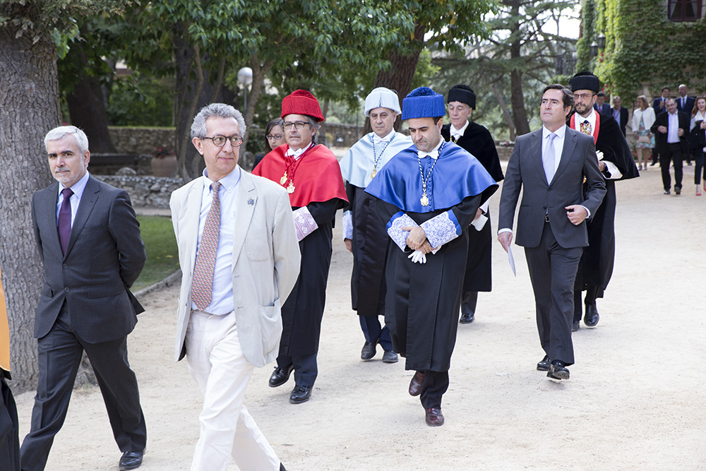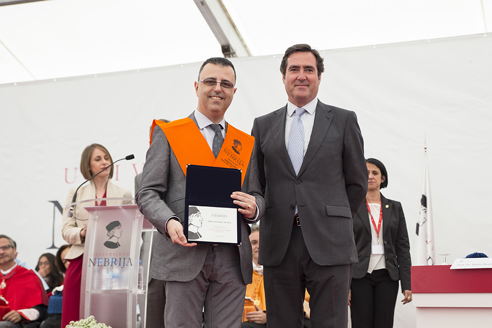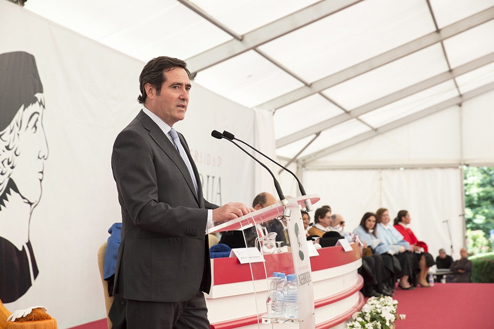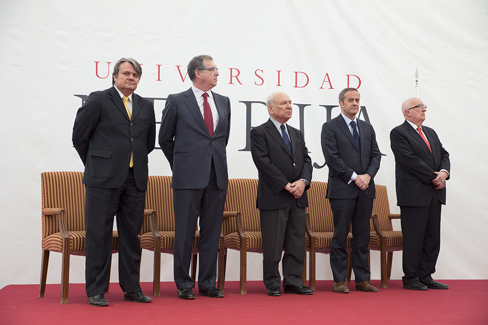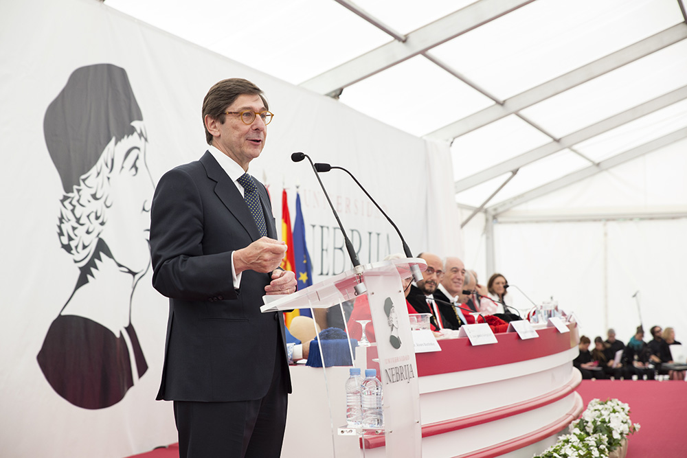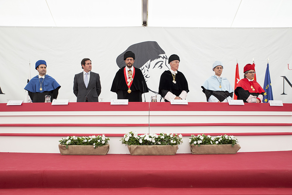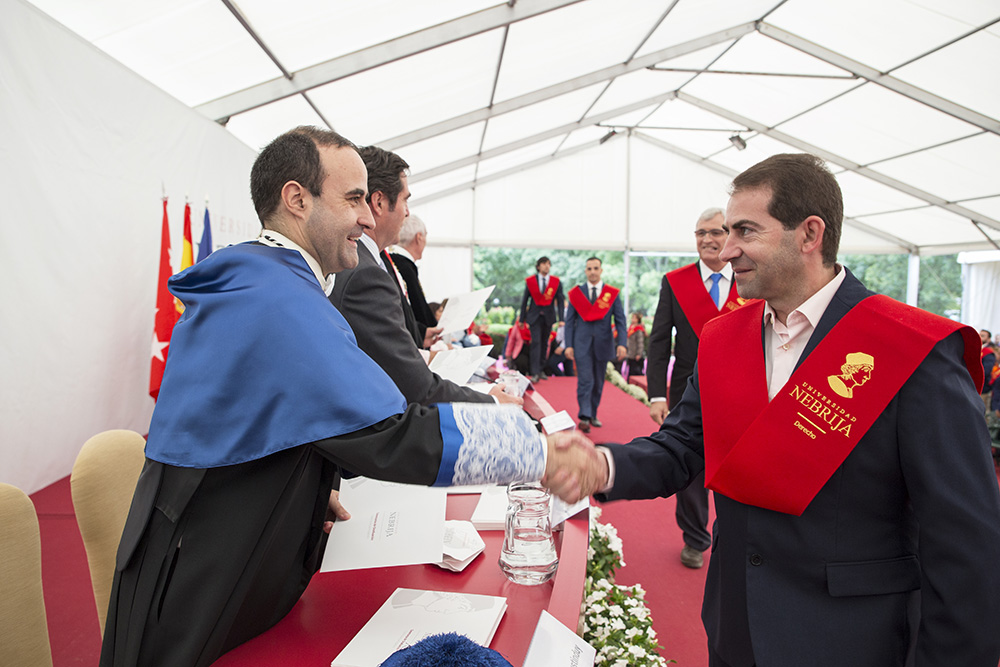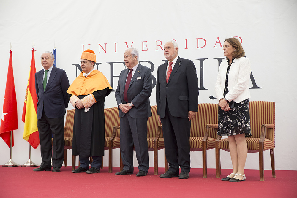 Los padrinos que acompañaron a los alumnos este año fueron José Ignacio Goirigolzarri Tellaeche, presidente de Bankia, en la ceremonia de la mañana y Antonio Garamendi Lecanda, presidente de la Confederación Española de la Pequeña y Mediana Empresa (CEPYME), en el acto celebrado por la tarde. Los dos actos de graduación comenzaron con la entrada de los alumnos que se graduaban y el claustro de doctores de la Universidad Nebrija. El rector Juan Cayón inauguró en ambos casos el acto y dio paso a los padrinos.