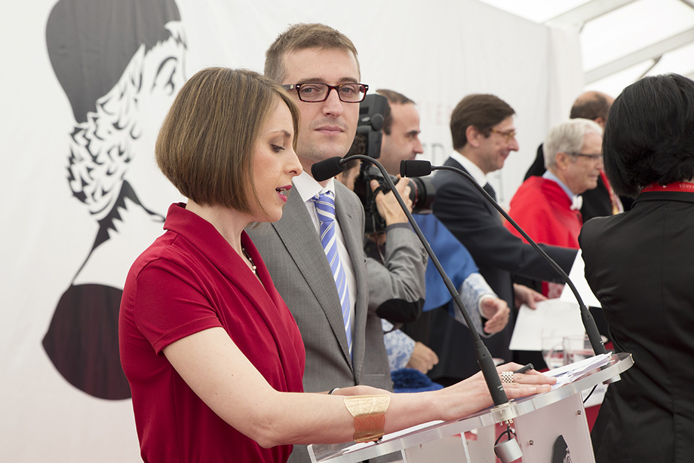Eduardo García Cancela, Marta Díaz García y José Mª Pérez Mora, en representación de todos los alumnos graduados, dieron las gracias a los profesores por sus consejos, a las familias por su apoyo incondicional y mostraron la gran ilusión que comparten con sus compañeros por salir al mundo profesional y llevar muy lejos el nombre de la Universidad Nebrija.