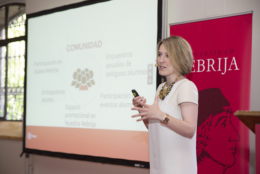 Carmen Solivera, responsable de Alumni Nebrija, explicó el nuevo proyecto que la Universidad ha preparado para los antiguos alumnos, con el renovado Club Alumni Nebrija y todas las ventajas de las que pueden disfrutar si siguen vinculados con la Universidad. “Nebrija es vuestro alma mater y queremos seguir acompañándoos también después de que terminéis vuestra etapa universitaria”, afirmó Solivera.