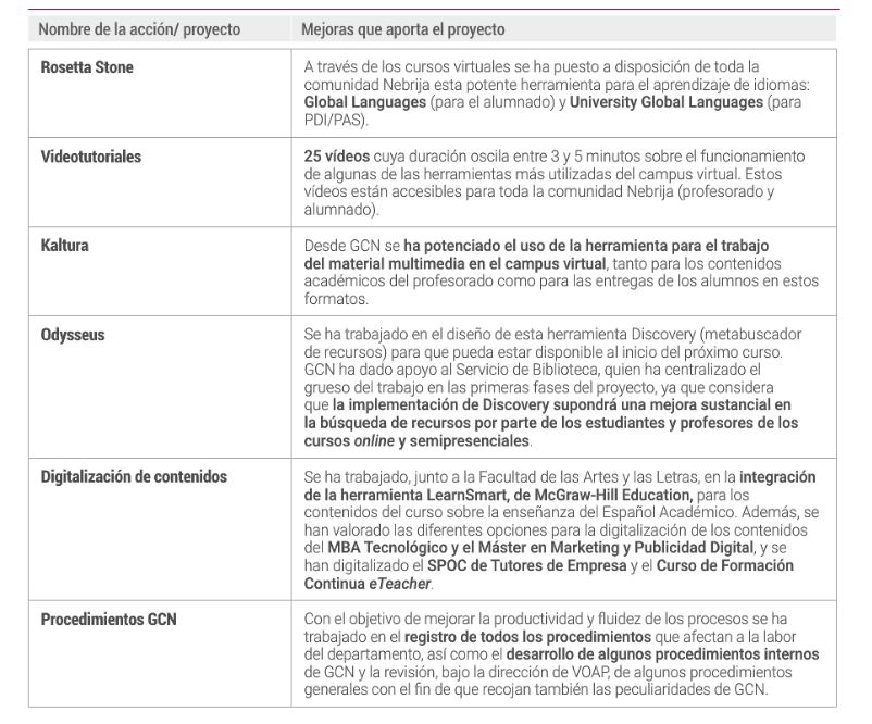 En la segunda parte se explican los proyectos de innovación tecnológica que desarrolla el departamento, siempre en colaboración con otras áreas de la universidad, como Global Languages, enseñanza de idiomas accesible para toda la Comunidad Nebrija; Videotutoriales, para conocer el funcionamiento de algunas de las herramientas más utilizadas; Digitalización, actualización de contenidos a formatos atractivos, innovadores y que favorezcan la interacción del estudiante con la materia; Odysseus, búsqueda de recursos por parte de estudiantes y profesorado de cursos e-learning y b-learning; Procedimientos, registro de todos los procedimientos que afectan a la labor del departamento y que facilitan y agilizan las diferentes tareas,metodologías Lean; Ingeniería Pedagógica, definición y diseño de la parte pedagógica de los nuevos programas e-learning y la Divulgación Académica, difundir la marca académica de GCN a través la elaboración de investigaciones, entre otros.