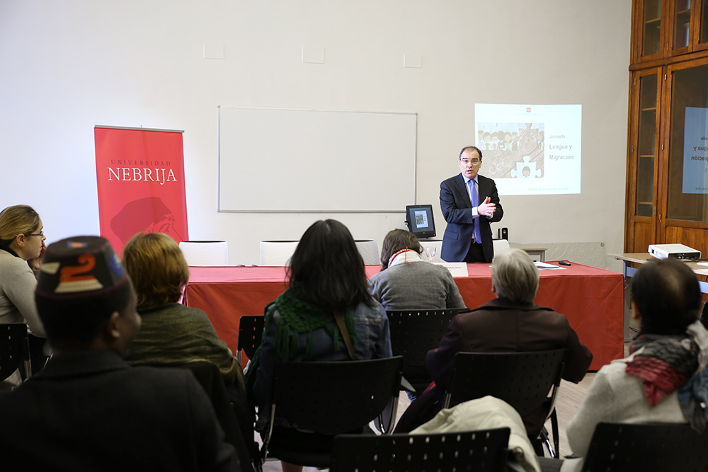 Por otro lado, habló de la importancia de la lengua para una adecuada integración: “Es indudable que uno de los factores clave para asegurar una integración plena del inmigrantes el dominio del español”. En este sentido, destacó la creación del Diploma LETRA (Lengua española para trabajadores inmigrantes), realizado en colaboración entre la Comunidad de Madrid y Nebrija. El Diploma LETRA es un proyecto de la Fundación Nebrija y de la Dirección General de Inmigración de la Comunidad de Madrid que tiene como objetivo promocionar, facilitar y garantizar que los trabajadores inmigrantes de la Comunidad de Madrid puedan alcanzar un cierto dominio de competencia lingüística comunicativa en español (hacerse entender en este idioma de forma hablada y escrita, y ser capaces de comprender lo que escuchan y lo que leen, todo ello de manera elemental).