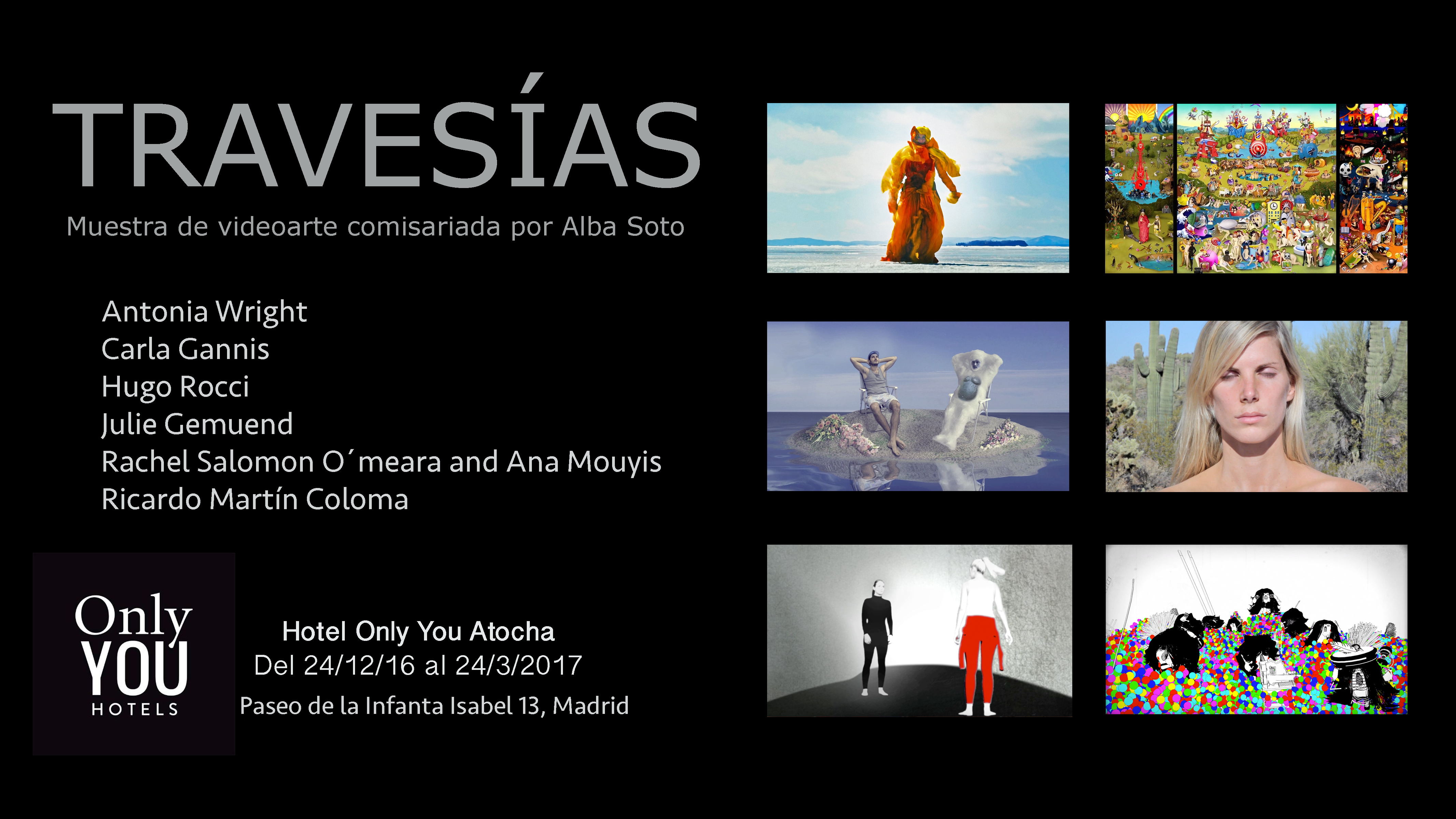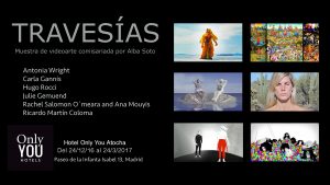 Artistas internacionales del videoarte participan en la muestra Travesías que podrá verse en el hotel Only You Atocha hasta el 24 de marzo de 2017. La muestra, comisariada por la profesora Alba Soto, del Grado en Bellas Artes de la Universidad Nebrija, está situada en la sala El Patio de dicho hotel.