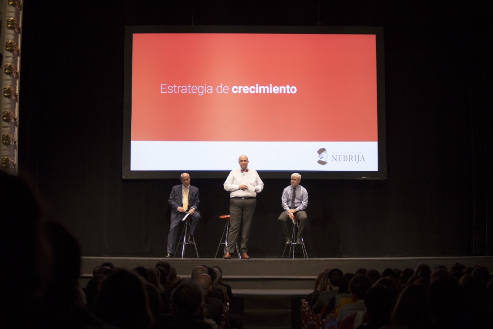 El rector quiso dejar claro que este Plan, que es de todos, “es ambicioso, pero realista”, y tiene la intención de que la Universidad crezca en cantidad, pero también en calidad: “Vamos a ser más exigentes con nosotros mismos y con los estudiantes porque solo así podremos ser una universidad de referencia: que la aspiración de los alumnos de bachillerato sea conseguir entrar en la Universidad Nebrija.” Enrique Fernández informó a los asistentes de la futura “incorporación de profesorado de investigación y docente” al claustro de profesores y que el Plan pone especial énfasis en “conservar el talento que ya hay dentro de la casa”. El papel de Isaac Sánchez fue el de compartir con la comunidad Nebrija la parte más “numérica”, con los gastos e ingresos que se prevén en el Plan Estratégico. “Vamos a crecer todos con responsabilidad, haciendo eficientes los gastos” explicó el director gerente con las cifras en la mano.