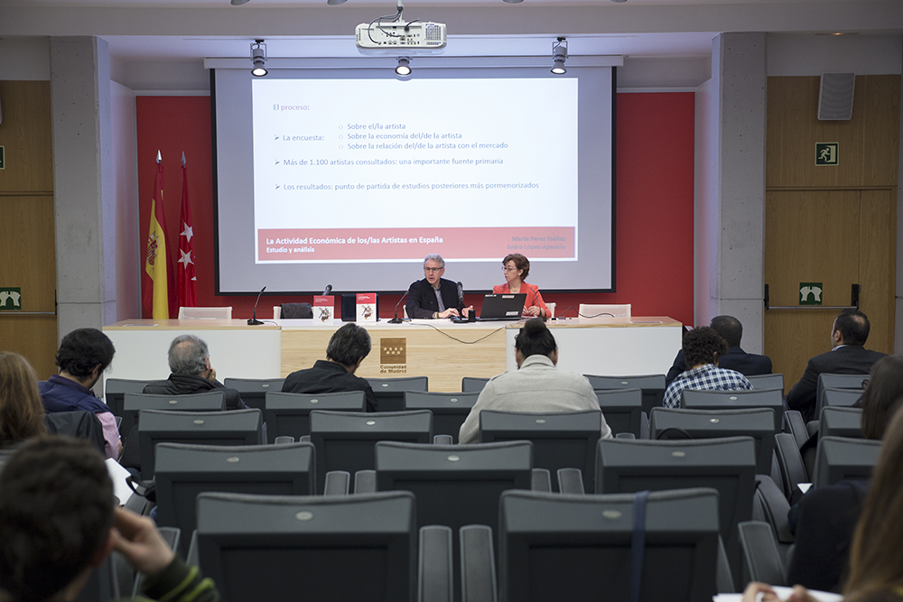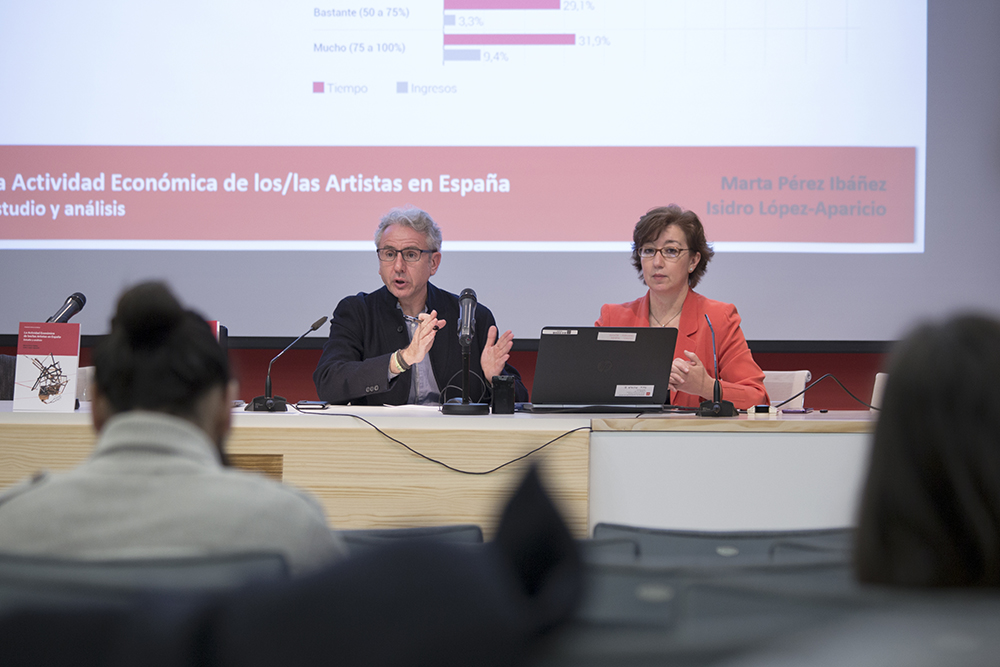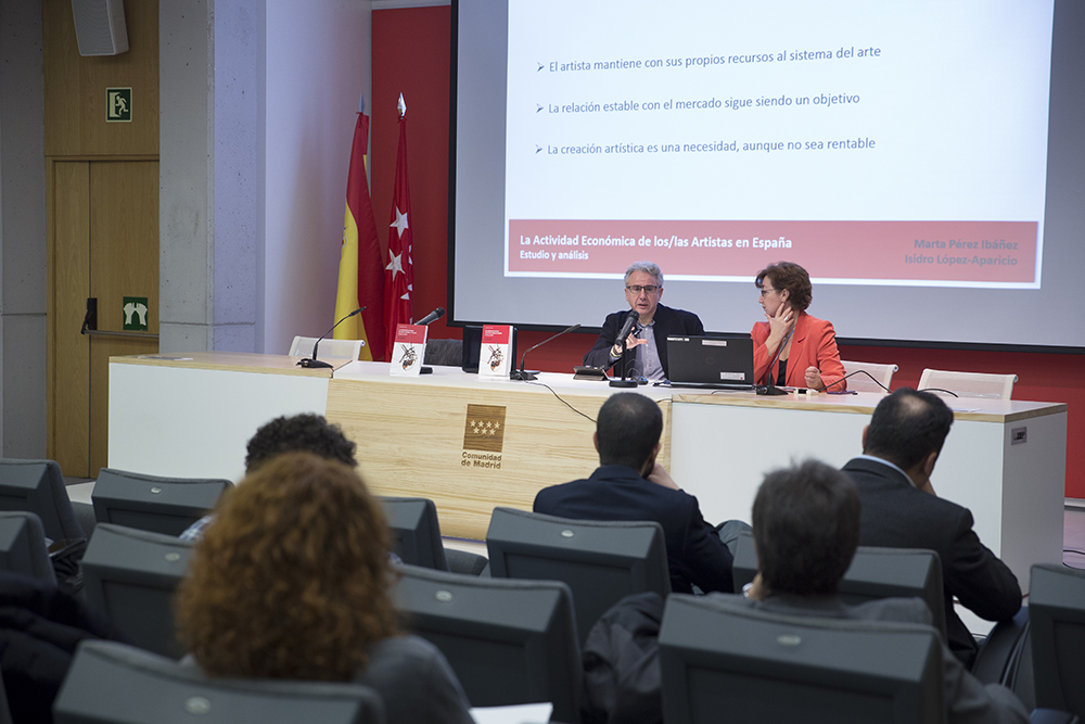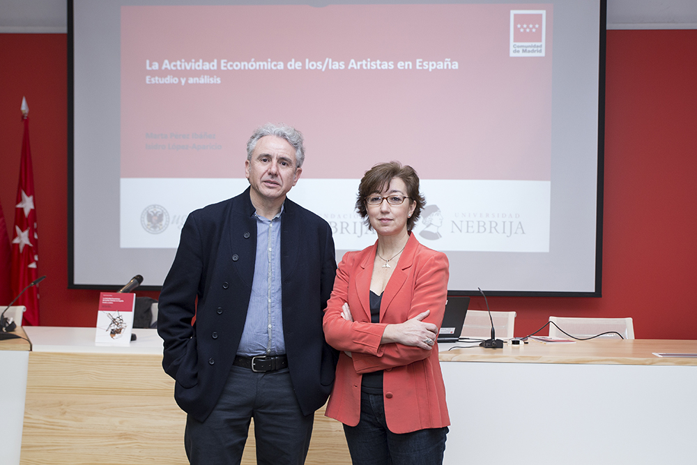Marta Pérez Ibáñez, profesora de la Universidad Nebrija, e Isidro López Aparicio, profesor de la Universidad de Granada, han presentado el estudio “La Actividad Económica de los/las Artistas en España”, hoy miércoles 15 de febrero en el Auditorio de Alcalá 31 de la Comunidad de Madrid.