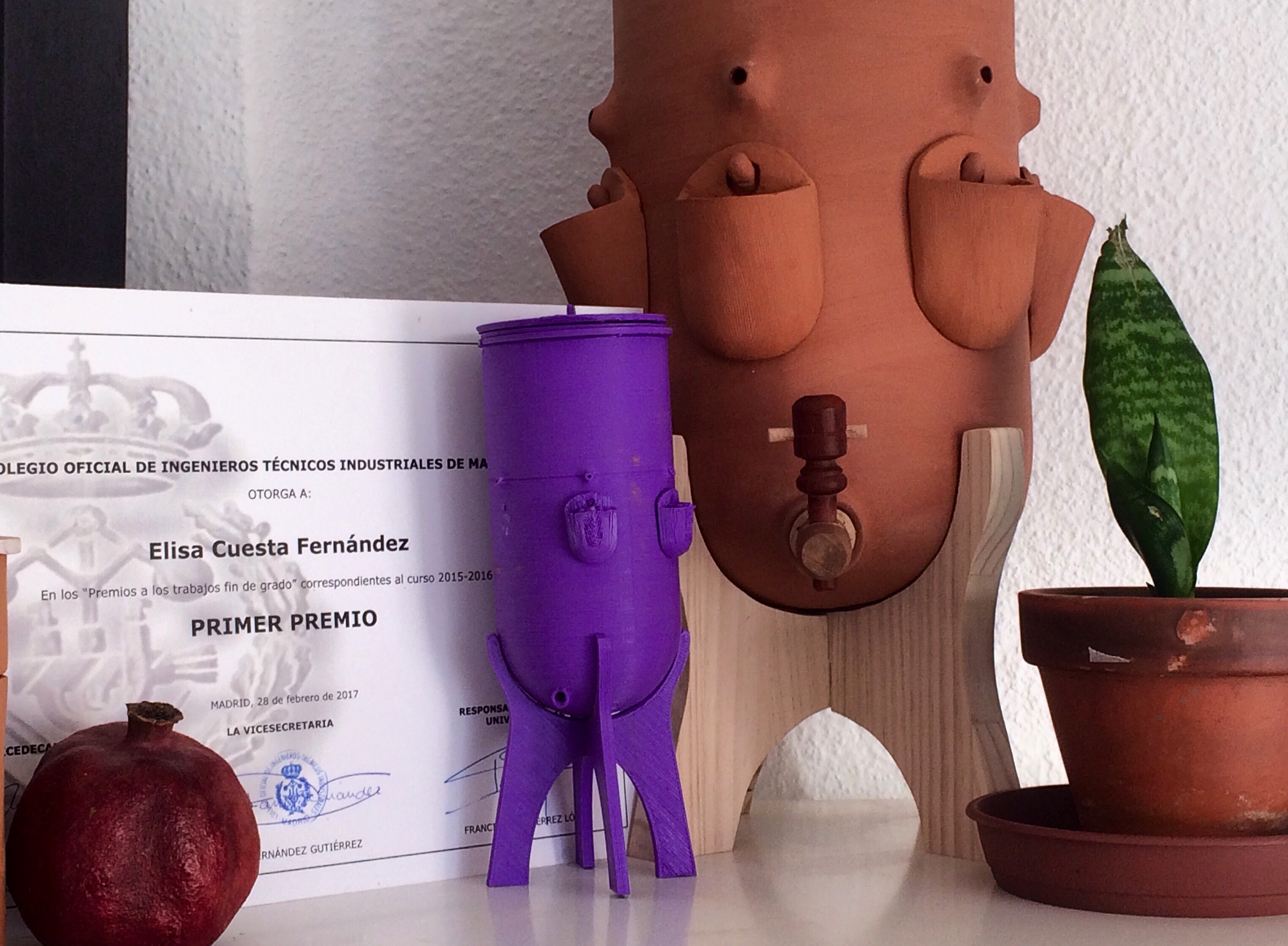 El proyecto de Elisa lleva por título: Sistema doméstico y sostenible de filtración de aguas no potabilizadas para comunidades en vías de desarrollo. En él se presenta el sistema doméstico de filtración Boti. Es un sistema de filtración y almacenamiento seguro de agua de bajo coste que emplea materiales naturales, abundantes y fácilmente accesibles. Además está fabricado mediante técnicas de manufactura tradicionales, de modo que puede ser reproducido localmente en cualquier parte del mundo sin necesidad de medios ni instalaciones complejos.