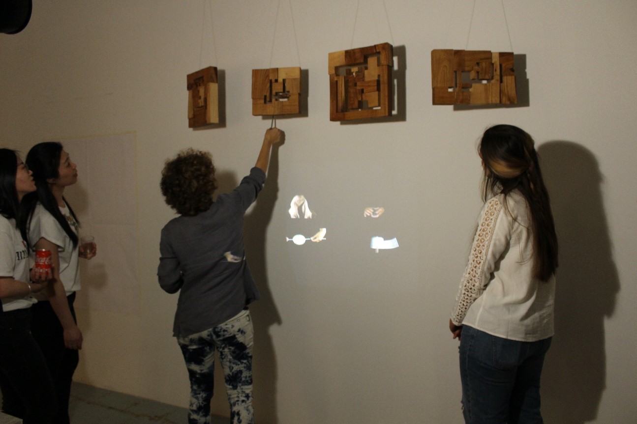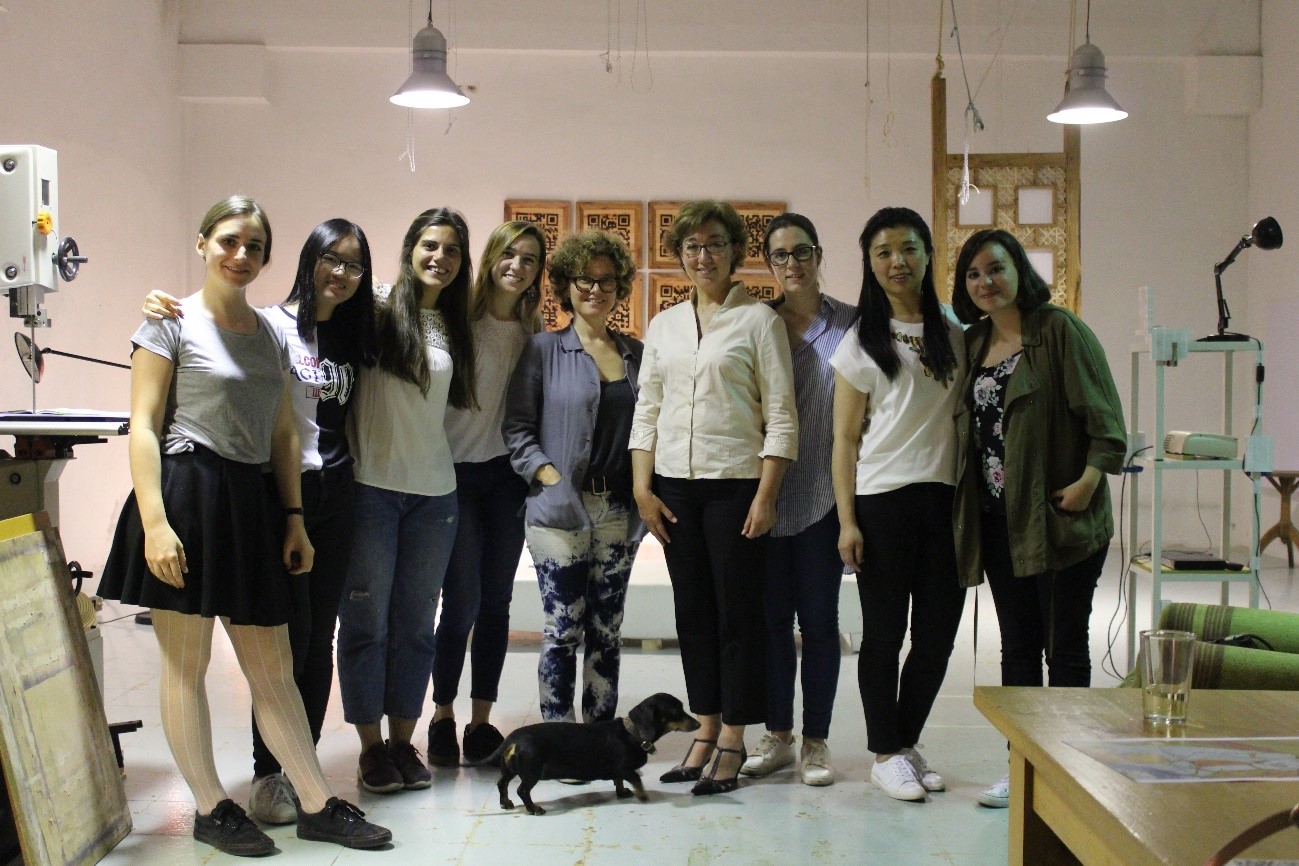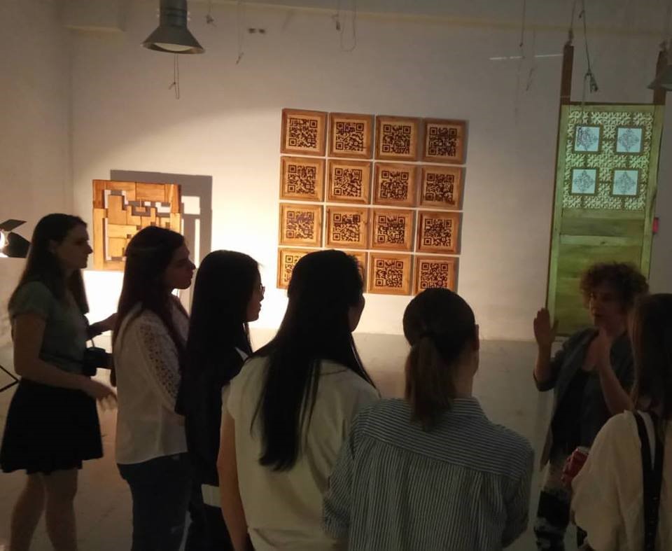 La obra de Clara Carvajal, a caballo entre la naturaleza y la tecnología, con un profundo substrato documental, histórico, conceptual y teórico sobre el que se apoya, sirvió de hilo conductor en toda la visita. En el estudio de Clara, donde actualmente trabaja también Rocío Martín Gorbe, antigua alumna de Nebrija y graduada en Bellas Artes, nuestros alumnos tuvieron ocasión de conocer algunas piezas de sus últimas series, como Écfrasis o La Lengua Perfecta, en las que se combina el trabajo en madera con la asociación entre la escritura cúfica y los códigos QR, y vieron algunos vídeos producidos por la artista, como Tradición y Manipulación. La visita fue una perfecta ocasión para descubrir mucho más que el proceso creativo y adentrarse en la gestión integral de la obra.