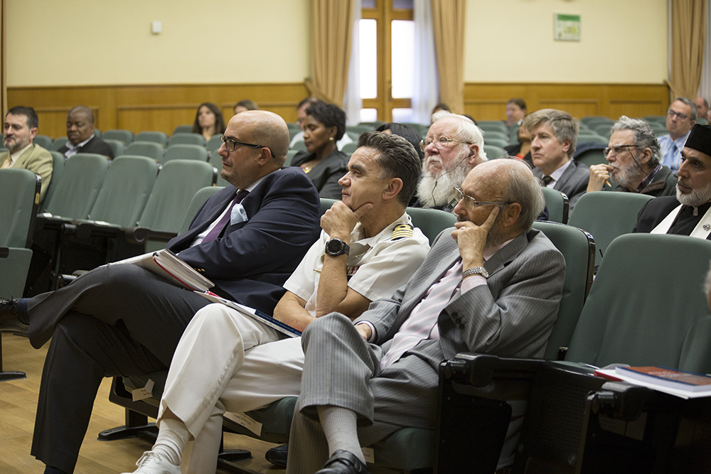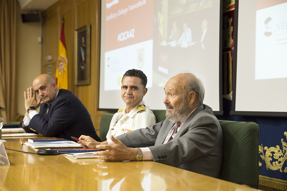 Ignacio García, capitán de navío, dijo en la inauguración esta edición, que “la biología no nos condena a la guerra; el diálogo es importante y puede resolver conflictos, de ahí la importancia de conferencias como esta.” Tras citar a los filósofos Zygmunt Bauman y su sociedad líquida –“el miedo líquido”- y a Hannah Arendt y el horror de la banalización del mal “una situación intolerable”, insistió en la importancia de no situar a los humanos como seres superiores ajenos al lugar en el que viven. Jesús Martín, presidente de la conferencia y director de la Cátedra, presentó el programa del encuentro, organizado, además de por la Cátedra, por el Movimiento Pugwash, fundado en 1957 por Albert Einstein y Bertrand Russell y premio Nobel de la Paz 1995.